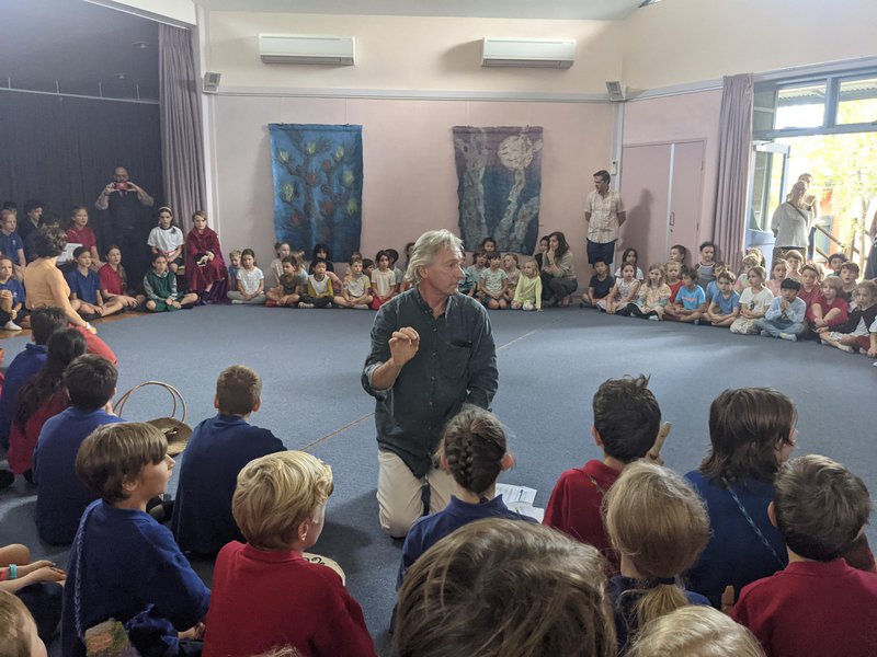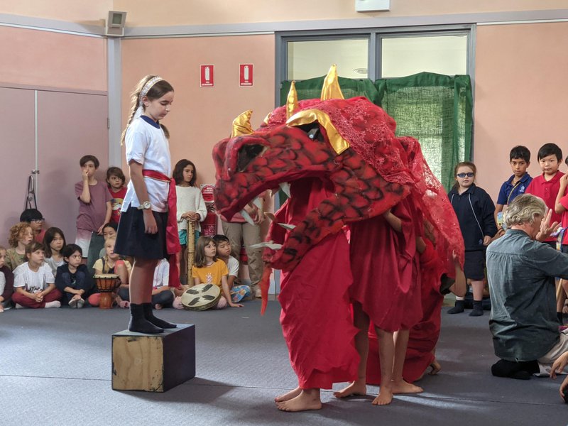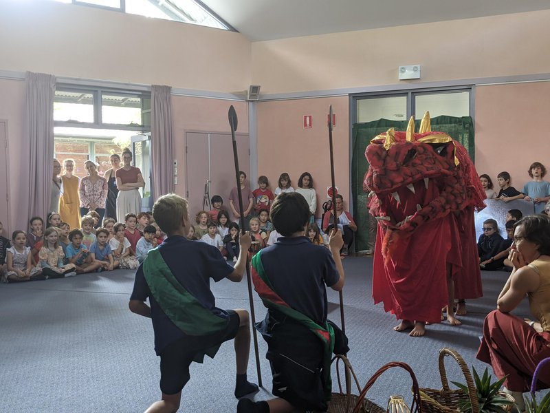 All 6 primary school classes came together on the last Friday at the end of Term 2 for the festival of Michaelmas - midway between the summer and winter solstices. It is an experiential treat as the hall is filled with voices, rounds, drama and music. The story of St. Michael and the dragon centres around an evil dragon holding the East at bay, and St. George (an earthly representation of St. Michael) tames the dragon with the Sword of Justice and Courage. It is Harvest time, as we gather our stores for winter, and the story reflects the gathering of our internal strength and light for the coming darkness of winter. Each class rehearses their own part - songs, music, poetry and drama - and they come together to perform as one. Class 2 prepared the fresh bread rolls and steamed corn, Class 3 rehearsed being the dragon, Class 5 played recorder and all classes from 1 - 6 rehearsed the story and their own songs. Thank you to all teachers and Class 5 teacher Katherine Arconati for working together on this event, and to Head of Music Ian Munns for playing the opening piano.