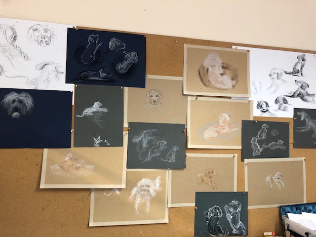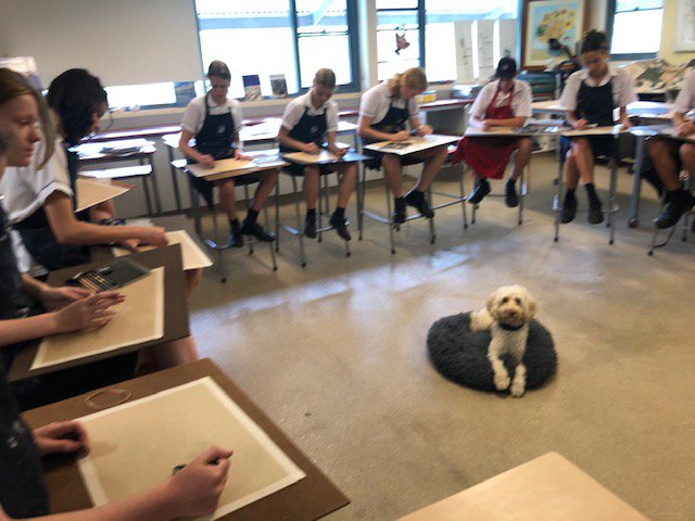 After Cal, short for Calico, spent the first hour at school as therapy dog for the Year 7’s getting their vaccine injections, he then modeled for Year 9 art students as they work through their Main Lesson unit on animals. Everyone loved Cal's visit and gained so much from what he brought. Cal, the little labradoodle was just what school required on Friday!