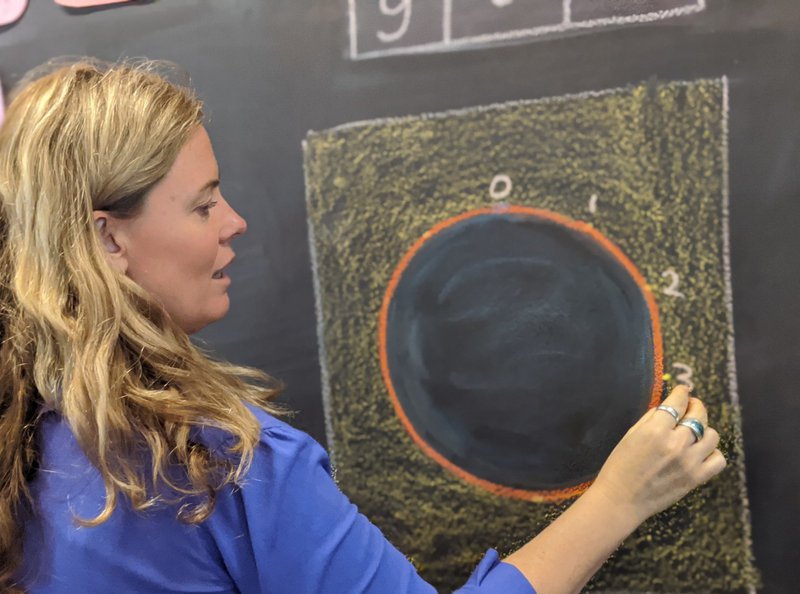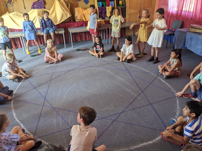 Class 2 is exploring the connection between times tables and geometry in their current Main Lesson. The focus is to discover the geometric patterns that arise out of a circle of 10 points and to develop a multi-layered approach to the times tables. In the stories, Ava the spider spins her web, and a boy works with the times tables to discover the underlying geometry. Each day the children make the web in morning circle, then make a web on the dowel boards and draw it in their Main Lesson books, all the time learning the tables.
