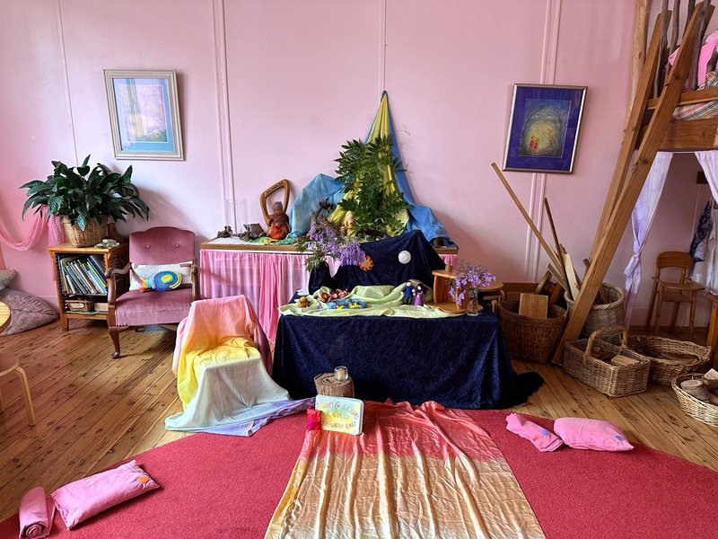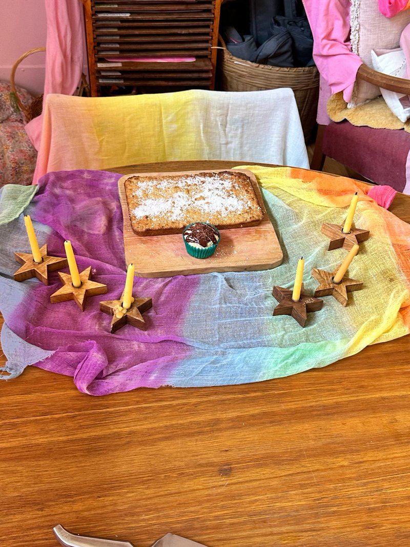 Birthdays in Kindergarten are festive occasions that give us a wonderful opportunity to celebrate and acknowledge each child with love and reverence. We make a birthday book, bake a cake, decorate a seasonal candle table, share songs and share the food we have prepared. The teacher prepares a little handmade gift for each child and at the center of each celebration is the telling of the birthday story by the teacher. This story brings an imaginative picture of each child’s unique journey into the world. The children hear the story of Little Starchild who looks down from the heavenly garden and longs to be born on earth. The Starchild journeys through the heavens with their angel and receives the heavenly gifts from the sun, moon and stars that they will bring to earth. And then, when the right parents have been found, the right preparations have been made and the time is just right, the angel leads the Starchild to the gate of birth. The child is born on earth and welcomed to their new abode.