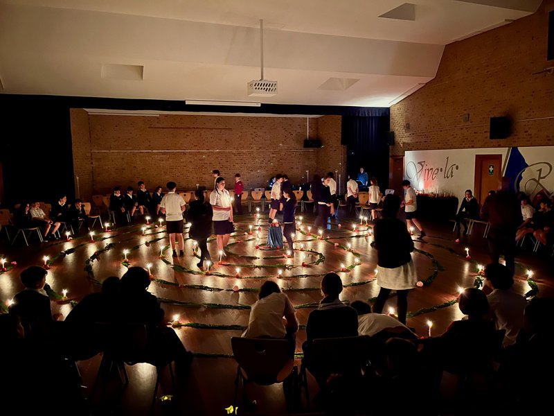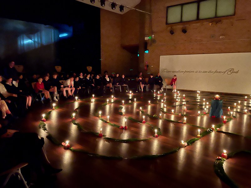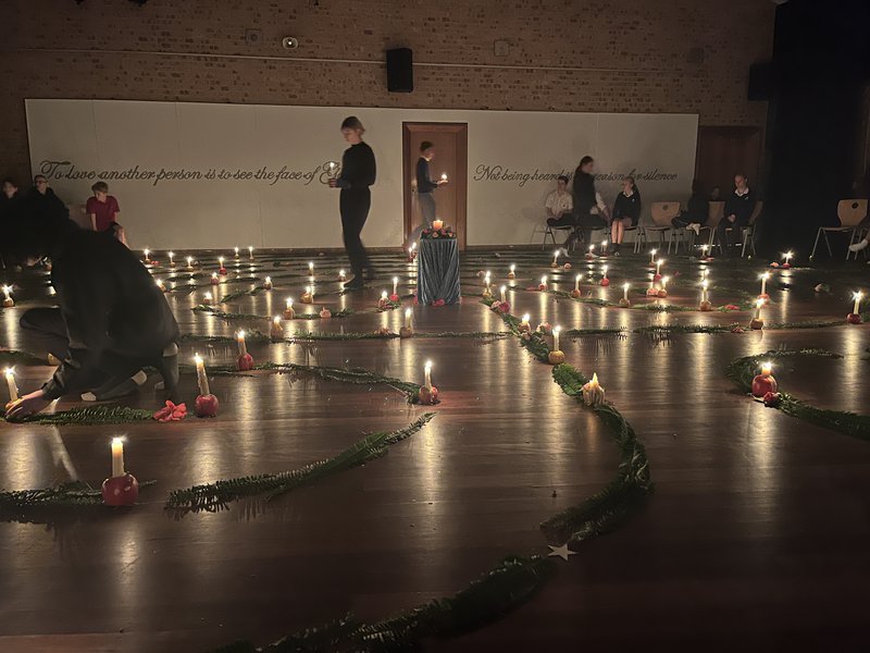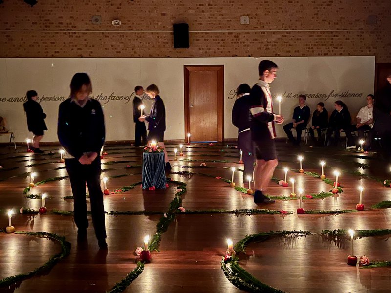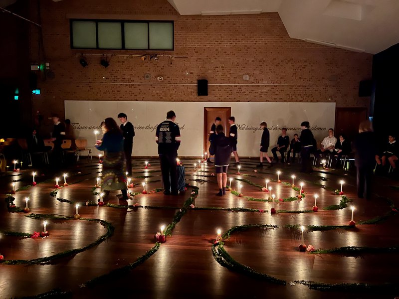 Last week, Glenaeon's Sylvia Brose Hall at Middle Cove was transformed into a Mid-Winter labyrinth for our Class 5 - Yr 12 students to walk, participate and reflect at this Winter Festival. A labyrinth is a little different to the spiral that our students and community are familliar with, so it was a very special. A labyrinth has "twists and turns spiraling us towards the centre and away, defying all attempts at rigidity and linearness", which is a description written by Glenaeon Alumni Anna Barouh-Davis, who's Yr 12 project saw her build a labyrinth in 2011 in the bush neighbouring the oval at Middle Cove.