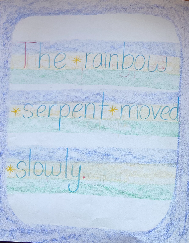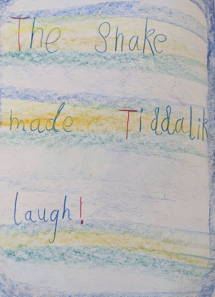 Class One has recently completed a Main Lesson centred on stories from the Aboriginal Dreaming. Stories of those animals unique to Australia were featured, giving a picture of these creatures in their natural habitat, and of course expressing their characteristics, in ways both humorous and profound. We heard about Tiddalik the Frog, who drank all the water in the billabong, and how the other animals tried to make him laugh so all the water would be restored to its rightful place. We heard about the special Platypus, who was invited by the birds to join their special group, by the water creatures to join theirs, and by the land animals, too. We heard, too, a legend about how the spirits in the sky asked Kookaburra to wake them each morning with his raucous laughter, so they would remember to light the fire of the sun each day. These stories were beautifully illustrated by the children, who also wrote sentences to encapsulate a significant theme or moment from each tale. In this way, the children developed both their literacy skills and an appreciation of our natural environment and the cultures of the indigenous communities who wove these tales for the benefit and enjoyment of all.