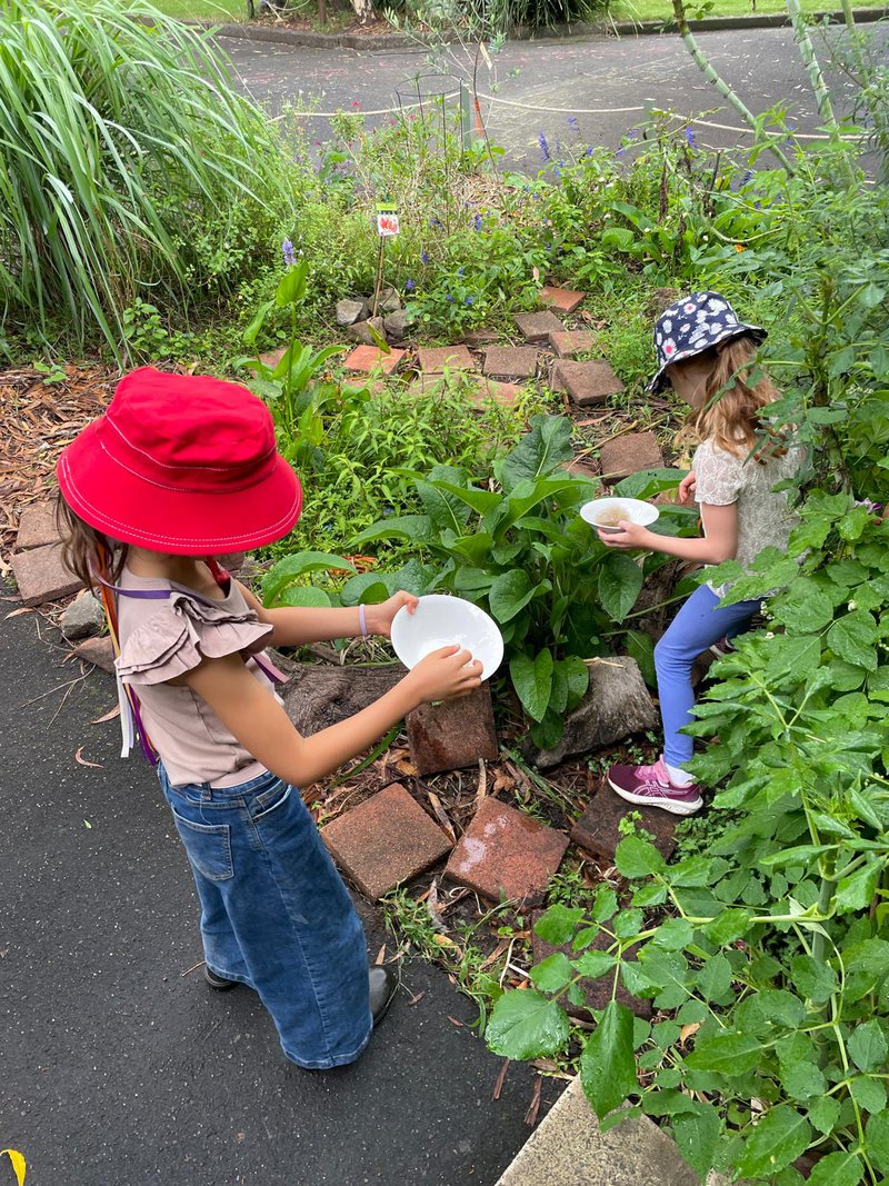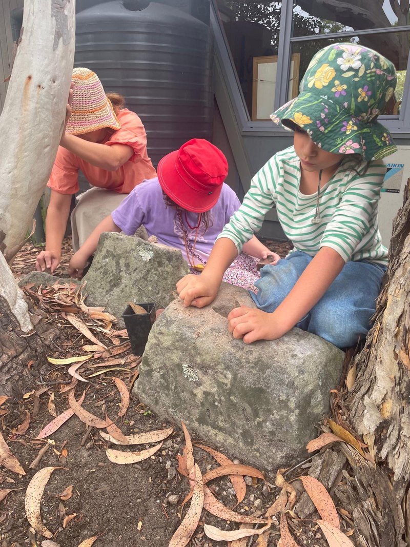 Today in Class 1 the children began with a eurythmy sequence about the trees and were then introduced to two biodynamic medicines to support healthy growth. They dynamised the water which contained these substances and observed the geometric forms that appeared as they stirred the potion. The children then ground up rock dust to mineralise the soil and sprinkled the stir over the garden beds. A kookaburra came to herald their work to finish the lesson.