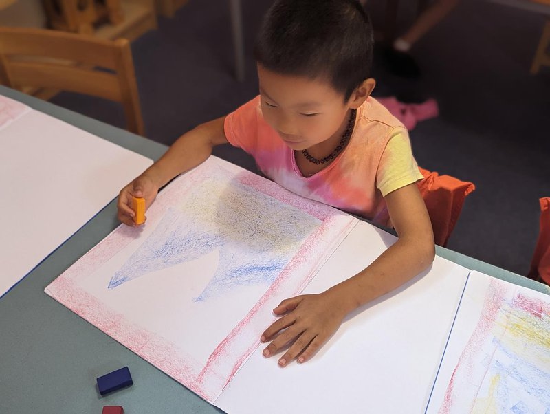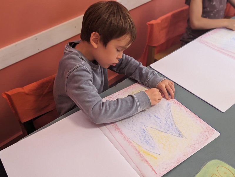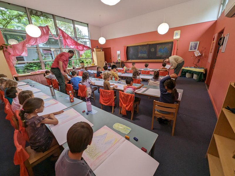 Class 1 have begun learning their capital letters with Class Teacher Jonathan Shaw. From the fairytales filled with adventures and fun emerges a picture that is drawn, expressing and formed to represent each letter. The big, blue bear comes from the story “Bearskin”, the M from “Semsi Mountain” and D for the “The Singing, Sawing Lark. The journey through the letters is exciting and beautiful as they explore many sounds, words and phrases containing the letters they learn.