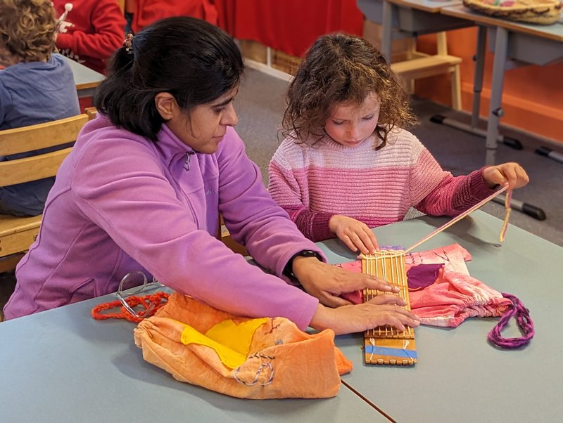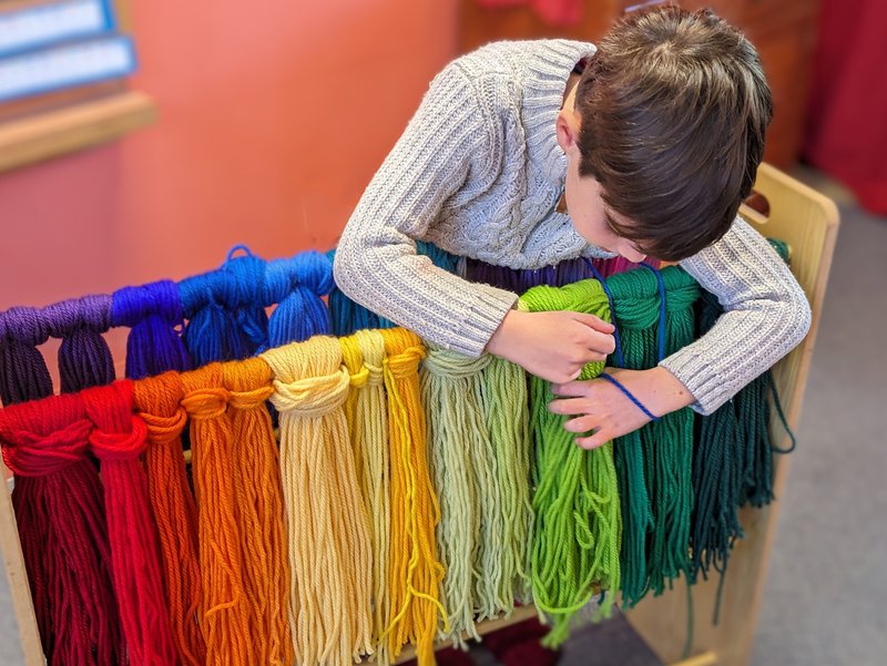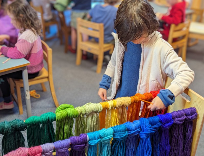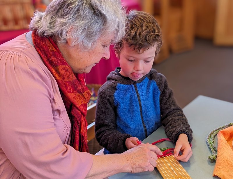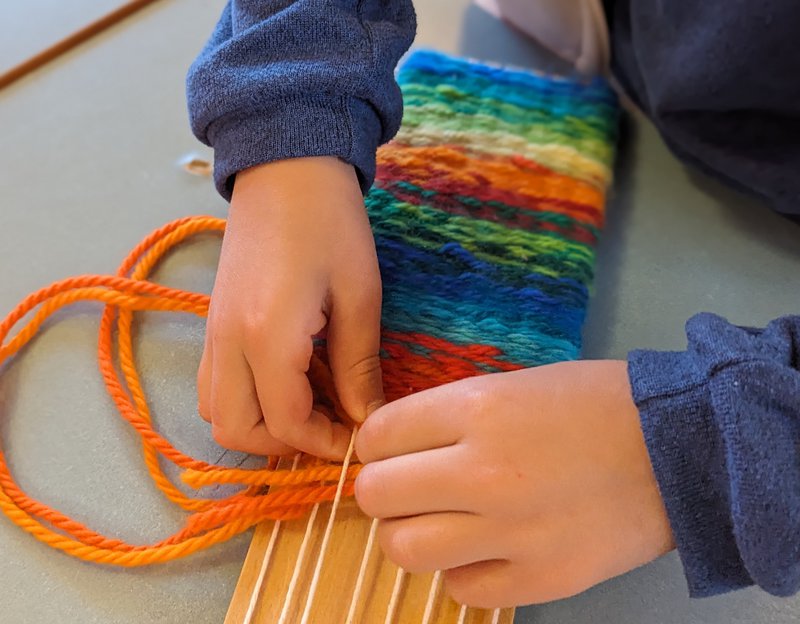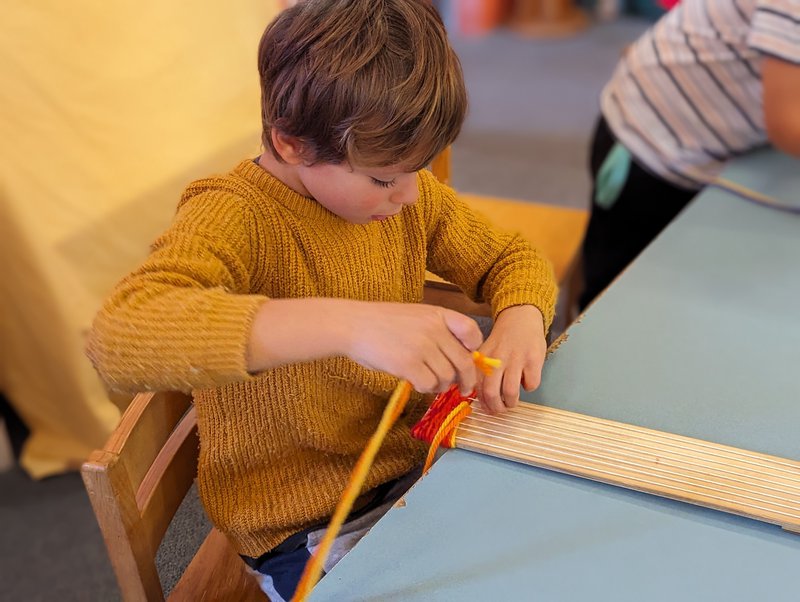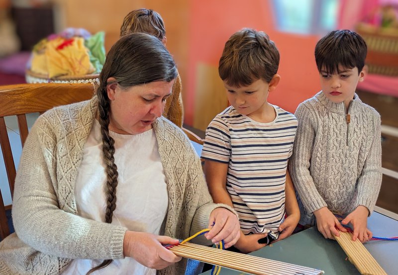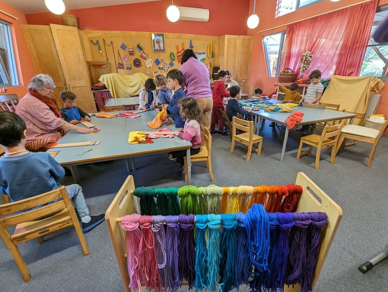 Class 1 have begun weaving their recorder bags. " Under and over and under again..." They have a beautiful poem about an eagle weaving. Her nest on a cliff ready to lay eggs.... Choosing the colors they will weave the whole board and then plait a strap so it hangs around their neck. This recorder bag will stay with him all the way through primary school. It is a remarkable project in that it takes a lot of dedication, care and time to create such a beautiful and useful piece of hand work. Handwork teacher Elizabeth Ellean and Assistant Meg Quinlisk work with the students each week to develop their skills and coordination in such a complex project.