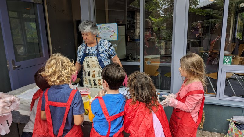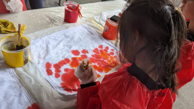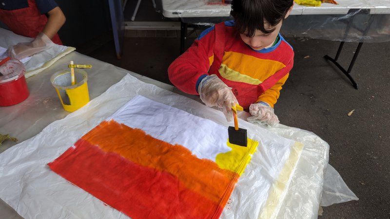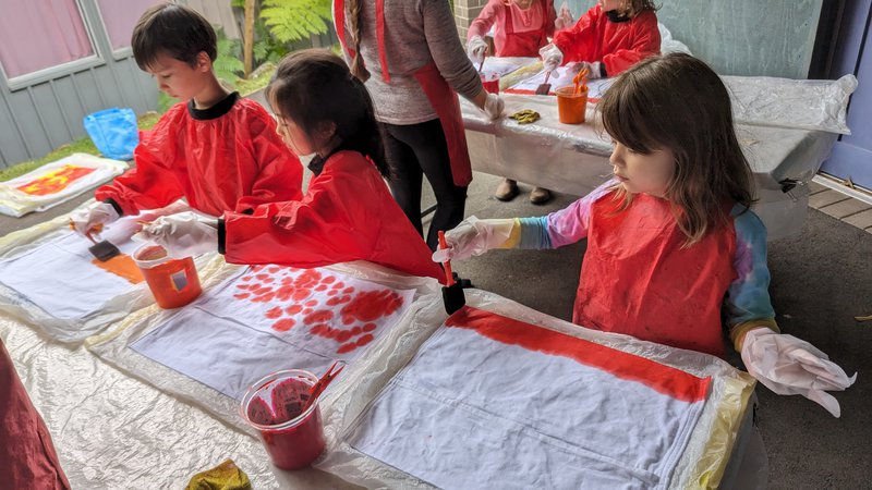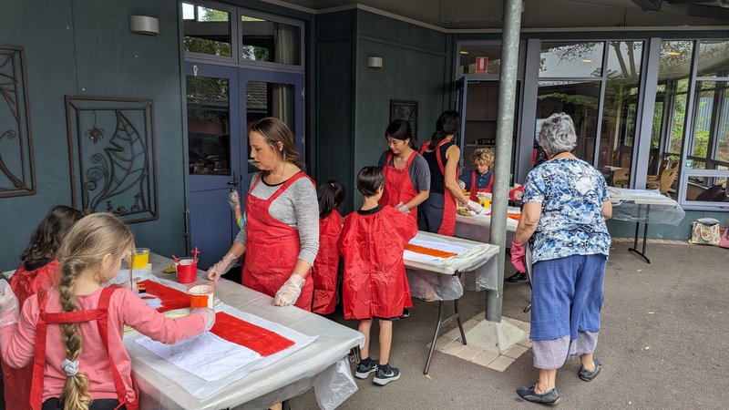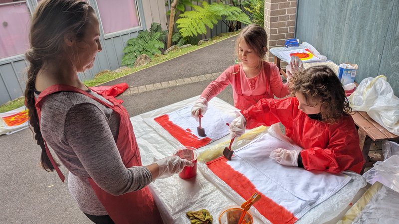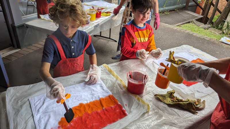 Class 1 hand-dyed their own chair bags with teacher Elizabeth Ellean. Assistant Meg and parent helpers. Taking a sewn calico bag, they painted their own designs in warm colours, which will be set and then dried. These bags will hang on the backs of their chairs and hold their books, pencils and other useful things! They are so bright and beautiful – thank you to our parent helpers and well done Class 1!