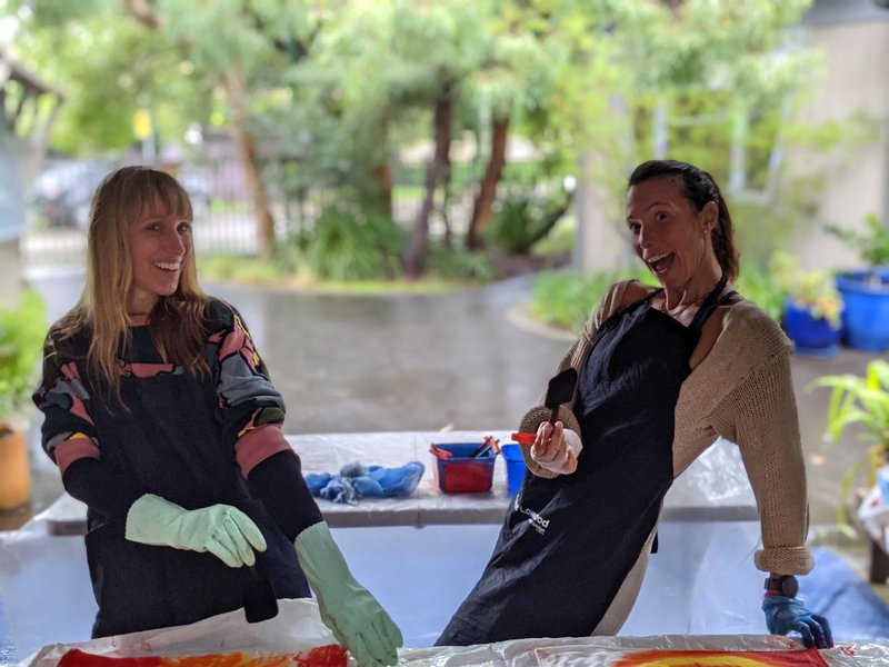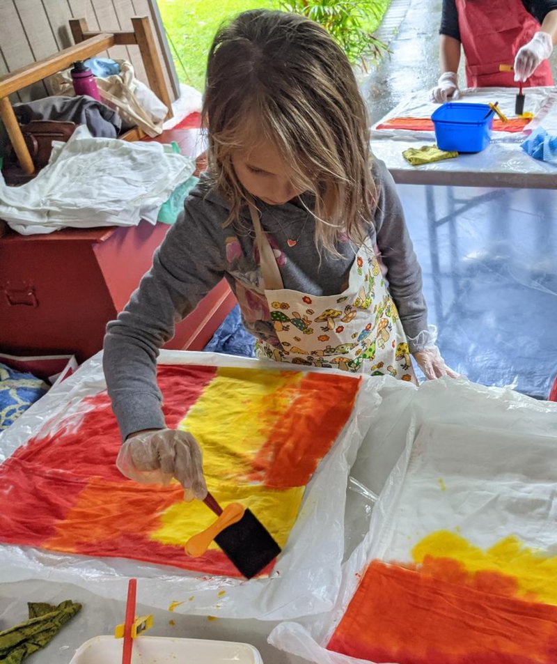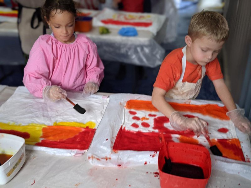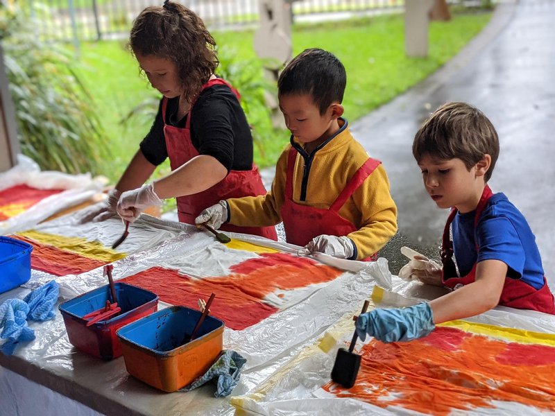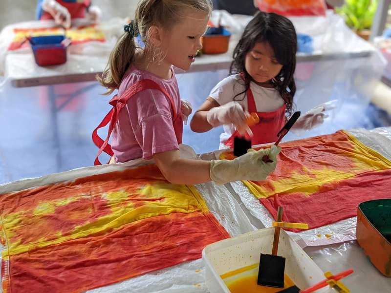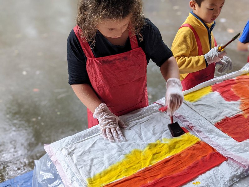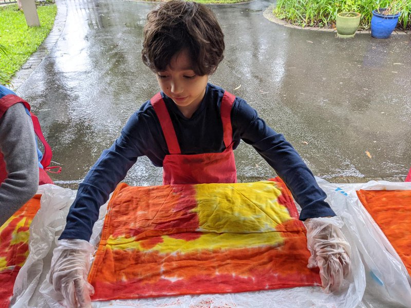 Engaged in a very creative outdoor activity, Class 1 students were able to dye their chair bags, even though it was pouring with rain! Under the building overhang, Handwork Teacher Elizabeth Ellean set up dyeing tables, where the children used vibrant colours to dye the bags that will hang on the backs of each of their desk chairs and hold their books, crayons and counters. It was a highly creative and colourful task, supported by our volunteers.