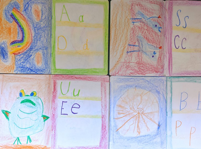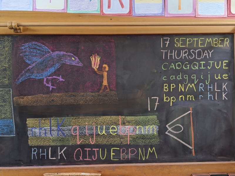To end the term, Class 1 have been experiencing some wonderful aboriginal stories of the Dreamtime. They have heard stories of the Sun Woman, the Moon Man, the Rainbow Serpent, the giant frog that drank up all of the water in the world and many other wonderful stories. They are filling their workbooks with both pictures and text, as they learn the capitals and lower case of each letter alongside the stories. Chalkboard drawings by Rodney Dean.