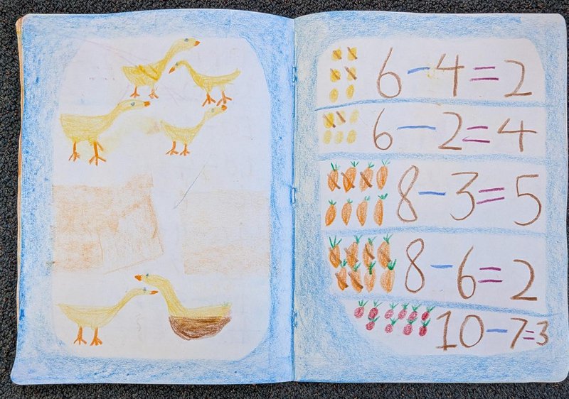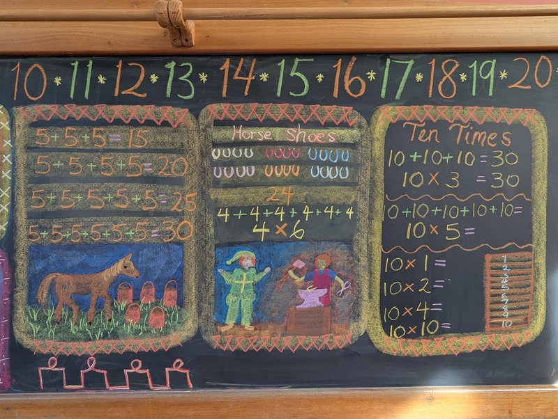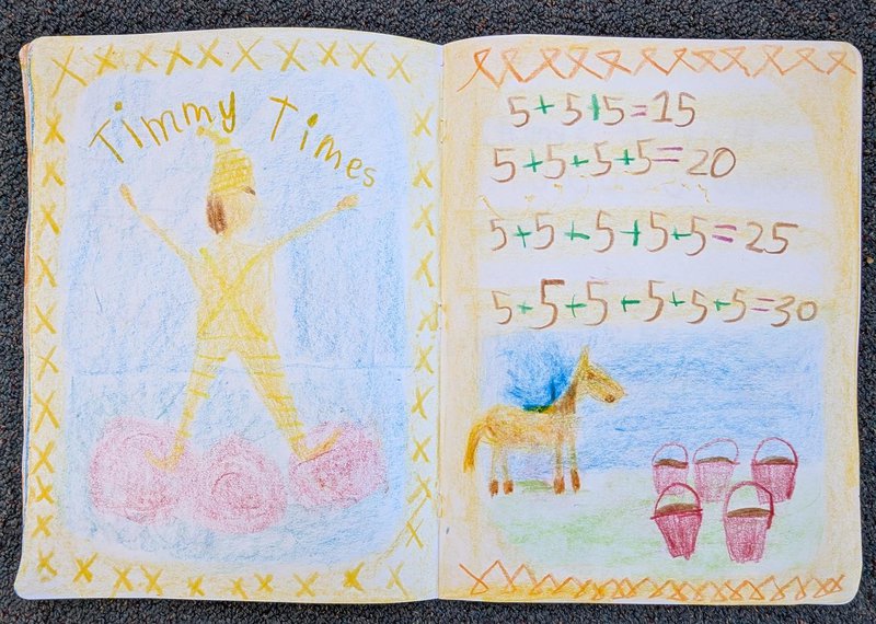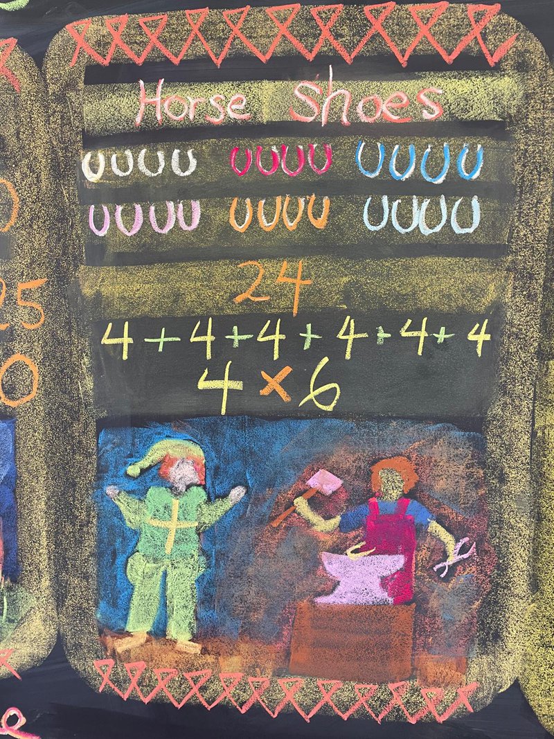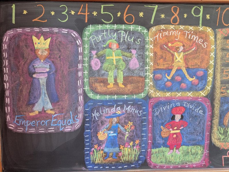 Class 1 is completing a four week Main Lesson that focused on the formal introduction of the four processes. After two terms spent developing number sense through counting, skip counting, quantity identification and informal work with the processes, the class was ready to take a deep dive into the next level of abstract thinking by learning to read, write and solve mathematical expressions involving the four processes. Of course, this is all done via the vehicle of the imagination so that each process is introduced with the help of a delightful character from the Land of Quantity. Emperor Equals oversees them all, and slowly gathers a robust team to ensure that all is fair and peaceful in the kingdom. Portly Plus- the counting collector, Melinda Minus – the considerate gardener, Timmy Times – the boisterous horse handler and Divina Divide- the judicious baker, all work together to solve many different problems and teach the children how to work with all four processes simultaneously. By introducing them all together, the children build deep, lasting number sense along with the capacity to recognise the meaningful relationships between them.