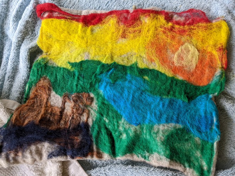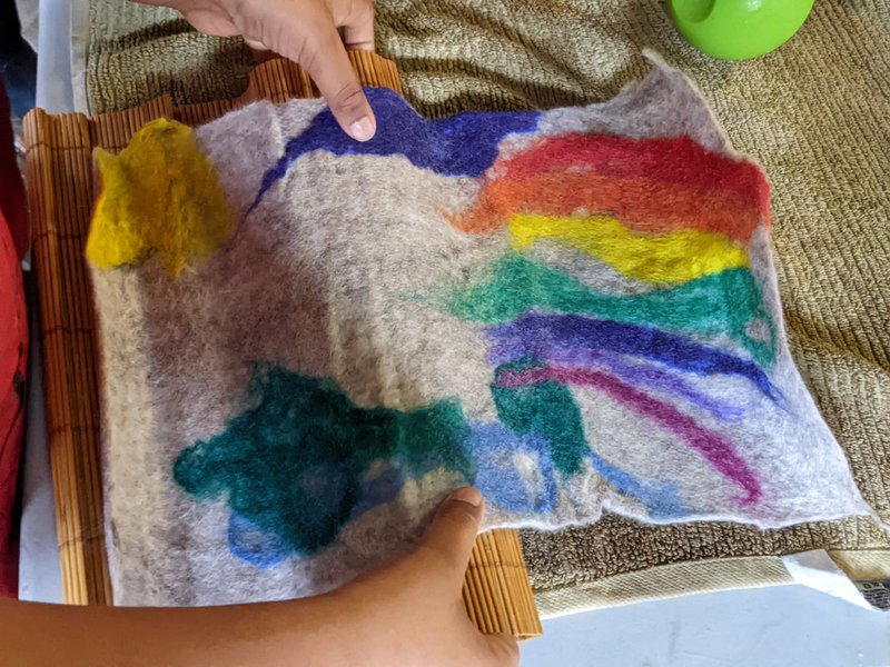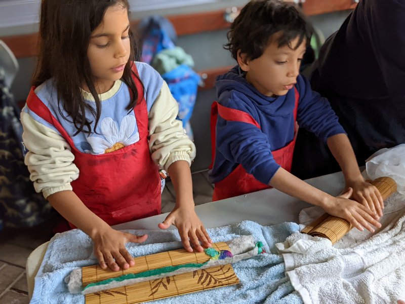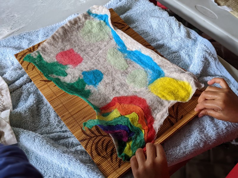 Class 1 had a wonderful wet felting hand work class with teacher Elizabeth Ellean. They learnt about the beauty and softness of wool and placed their fleece in patterns and pictures. With warm soapy water they roll it in the bamboo mat and felt the colours together. These will become beautiful counting mats as they use glass gems to count and do their maths! Even teacher Jamie Loftus made himself one too!
