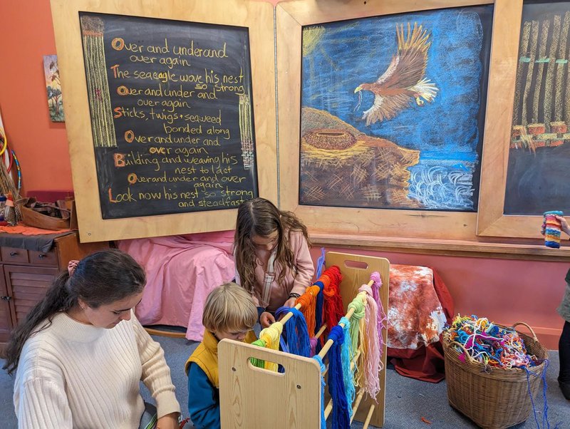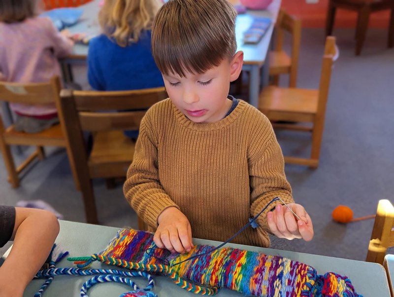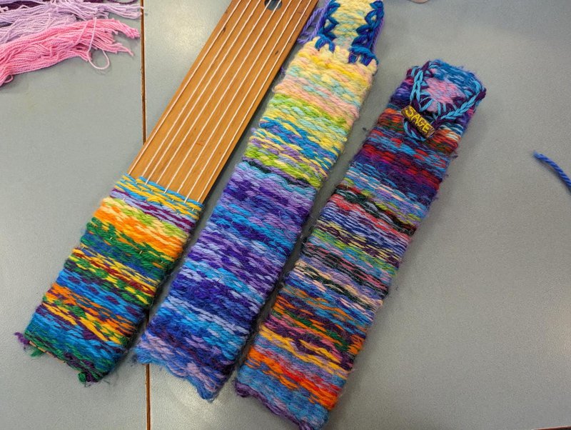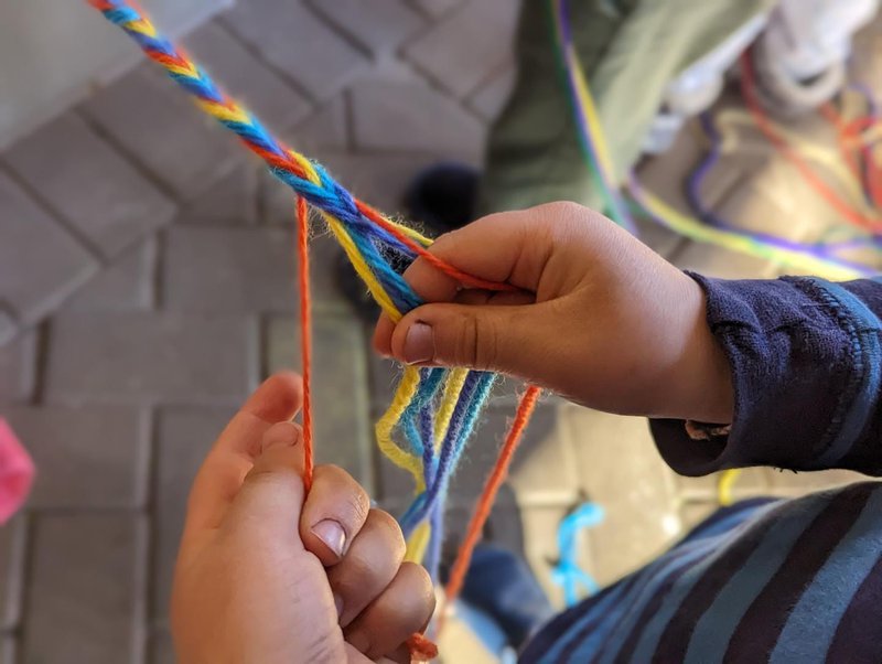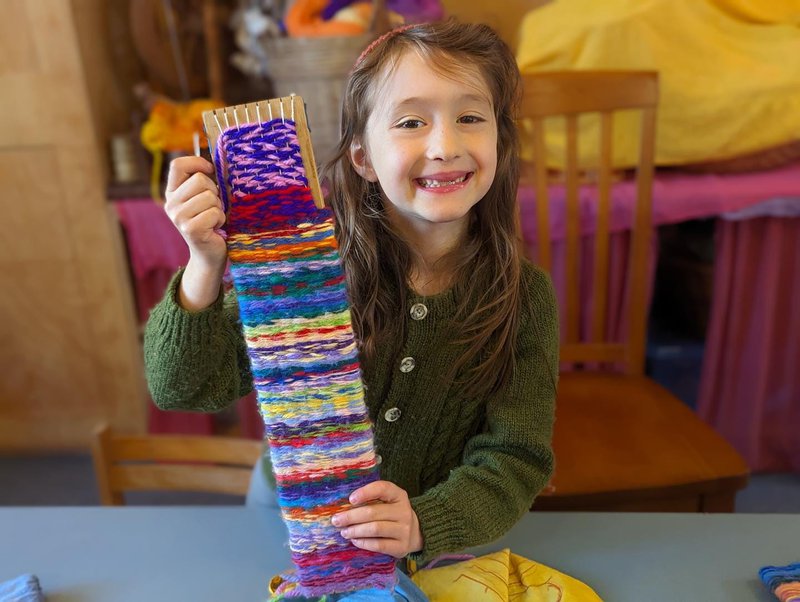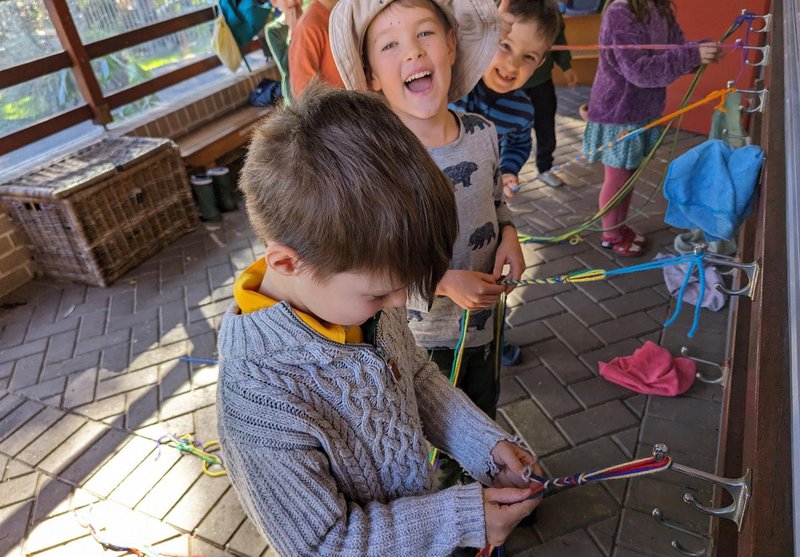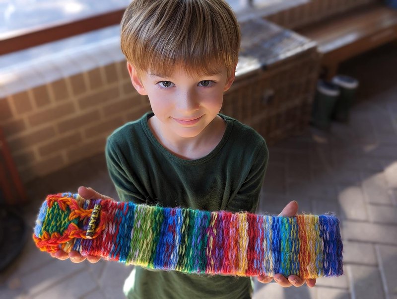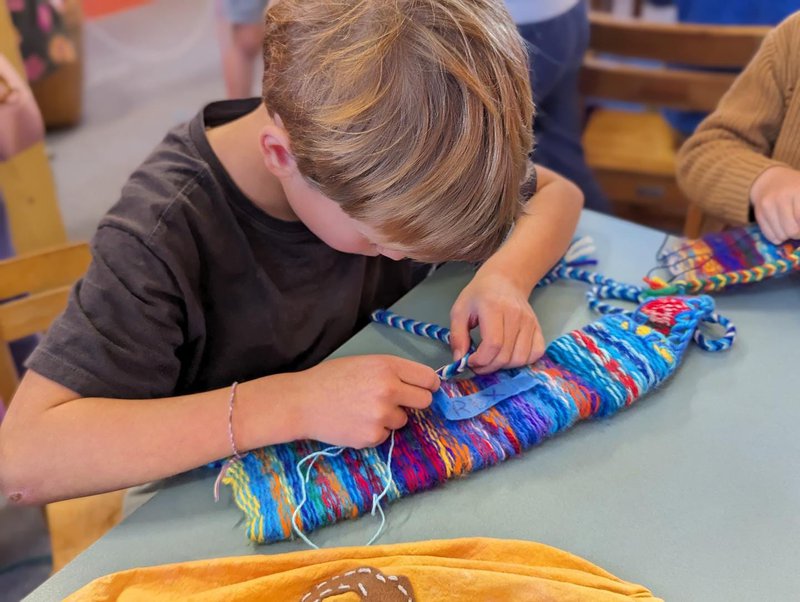 Class 1 have been busy weaving their recorder bags with Handwork teacher Elizabeth Ellean and parent volunteers. Using a weaving board, they carefully filled the strings with threads, making the bag thick to protect their new recorders. They plait a handle using an 'Egyptian Plait' style with 8 strings and saw, and sand and attach hand-made button made from collected wood. The result is beautiful bags they will use all the way up until Class 5.