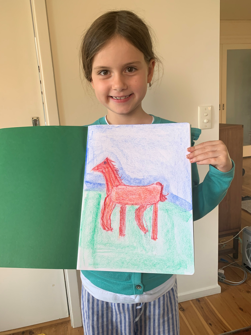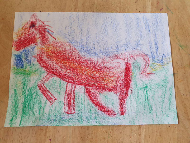 Class 1 have been making great use of their new stick crayon sets, which teacher Rodney Dean recently gifted to all his students. Rodney has been busy uploading audio stories and video files for home learning. Class 1 have been practising reciting their alphabet, writing their capital letters with a focus on writing their first sentences. This week’s work comes out of the stories of Rapunzel, The 12 Brothers and other fairy-tales. The children have also drawn some marvellous pictures of a horse in their guided drawing lessons. Great work Class 1!