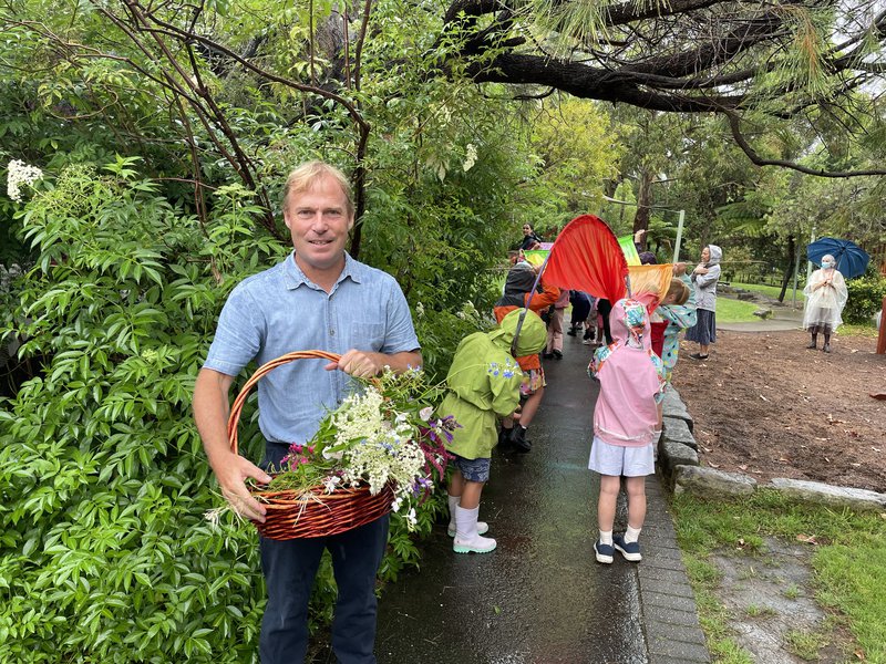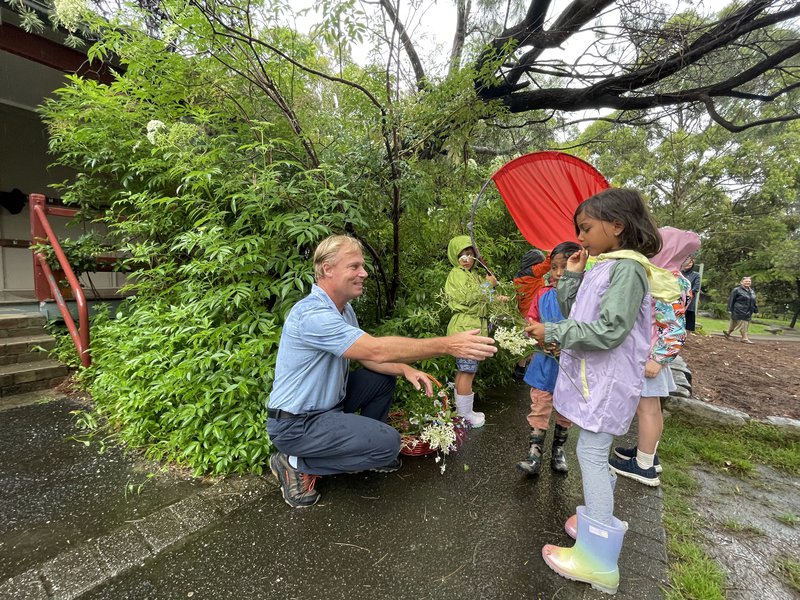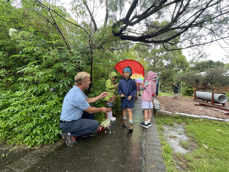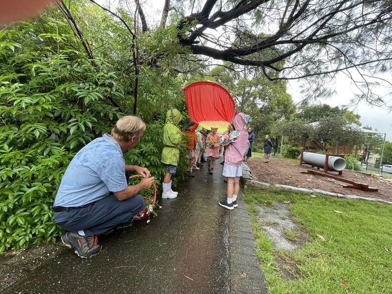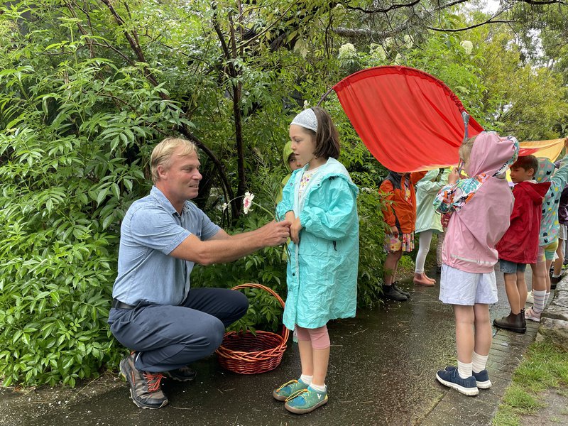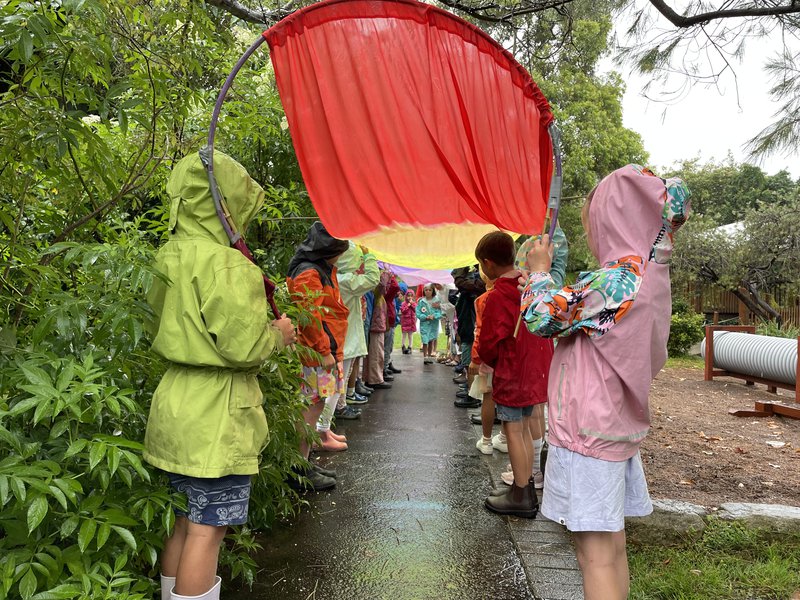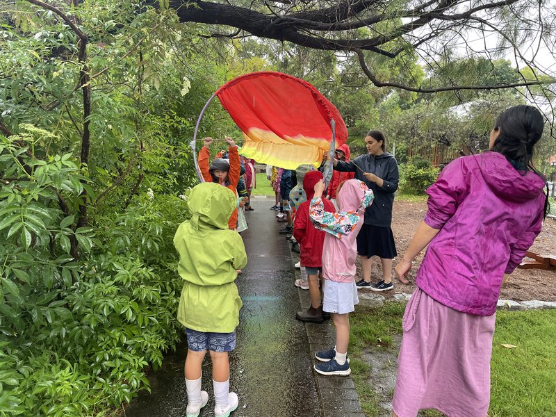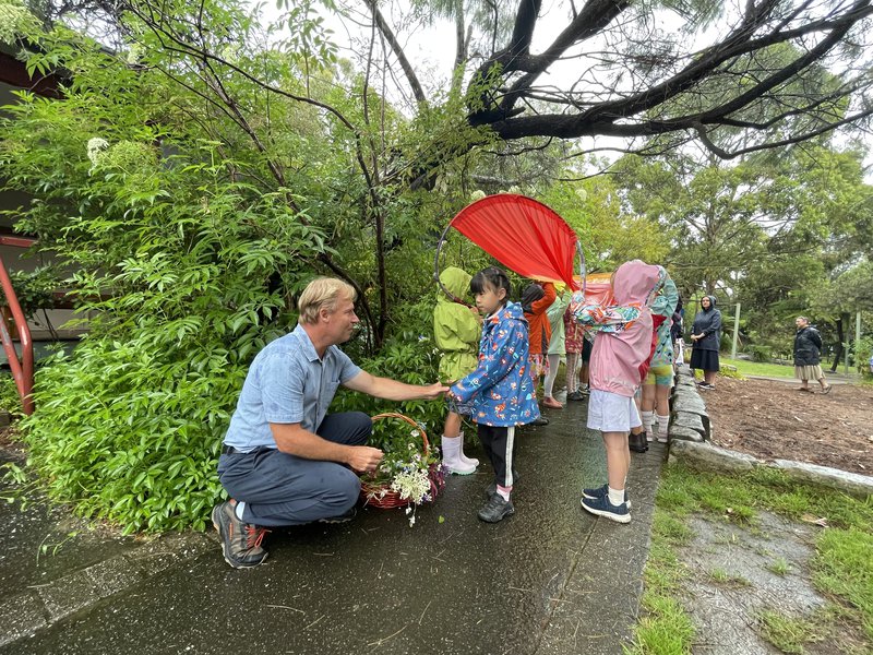 On the first day of school in 2022, Class 1 children met in the Kindergarten playground with their teacher from last year, Sarah David, Senior Teacher Catherine Pilko and Deputy Head of School (K-6) Dani Finch. They shared their morning song together before walking through the playground up to the Class 1 area. Class 2 children formed a beautiful 'Rainbow Bridge' with a long silk and flowers. The Kindergarten teacher then said goodbye and gave each child a flower to take with them 'under the rainbow bridge' to the other side, where their new Class 1 teacher was waiting. The year's Class 1 teacher, Jamie Loftus, received them and they made their way as new Class 1 students. The special 'Class Teacher' period thus begins, and Jamie Loftus will now guide these children through their primary years with the help of other specialist teachers. The rain did not dampen the enthusiasm or enjoyment of this beautiful rite of passage.