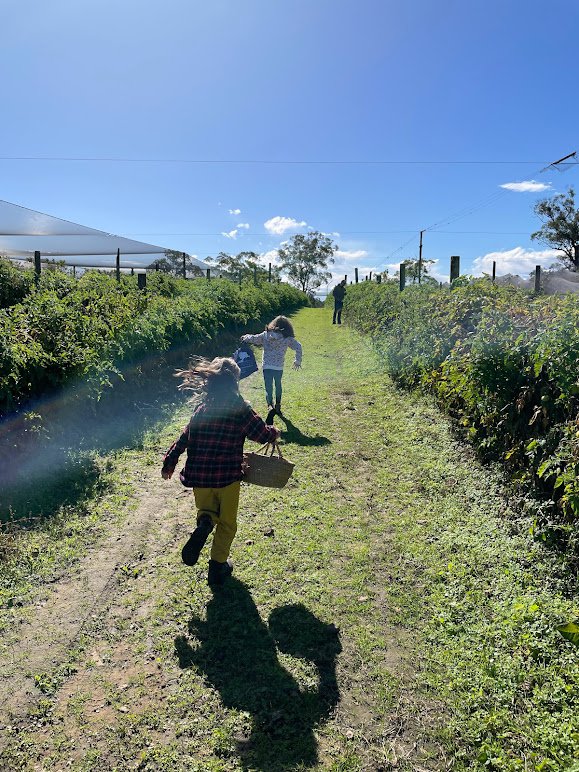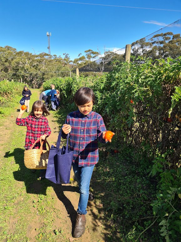 Winter came early on Sunday and everyone brought their woolly layers, with rain clearing to blue skies just in time for a merry tractor ride around the orchard. Then, it was time for fruit picking, and the children skipped along with their baskets and bags harvesting tomatoes, persimmons and limes - spotting beehives and farm animals along the way. Families gathered for a warming picnic lunch, enjoyed some more playing and chatting on the orchard grounds, with a last visit to the animals before home time.