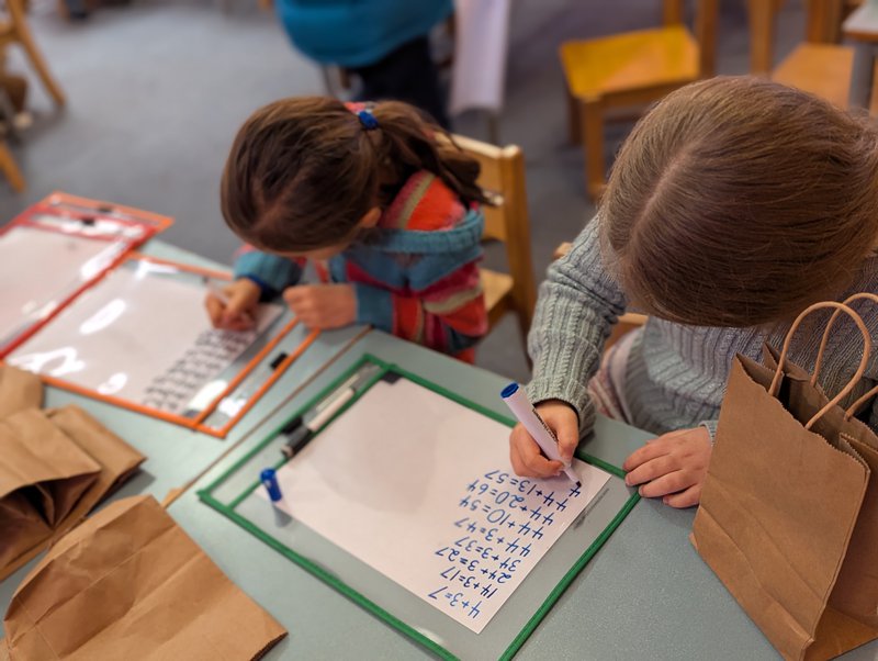 The children are also beginning to build strategies for working with larger numbers. Instead of moving straight to vertical algorithms, we are encouraging them to solve problems left to right, guided by their strong understanding of place value.