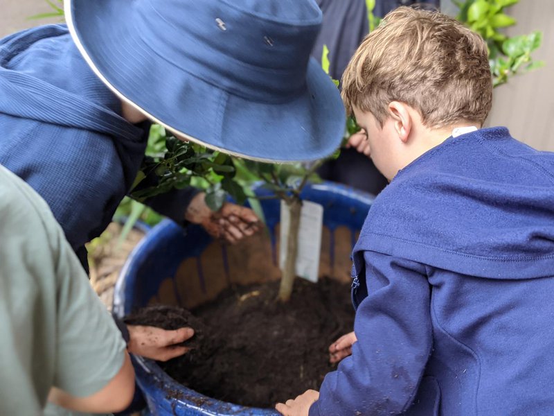 We have been slowly developing a Scent Garden outside Reception in beautiful blue pots, and this week gardening Teachers Kathy Thangathurai and Sandra Frain brought a beautiful Kefir lime tree to plant. The children trolleyed the freshly composted soil to the pot and planted it in the rain. Meanwhile, Kindergarten have also been digging out the compost and we welcomed volunteer Guchi to assist. Our beautiful sunflowers have been a welcoming joy in the early morning duty in the rain!