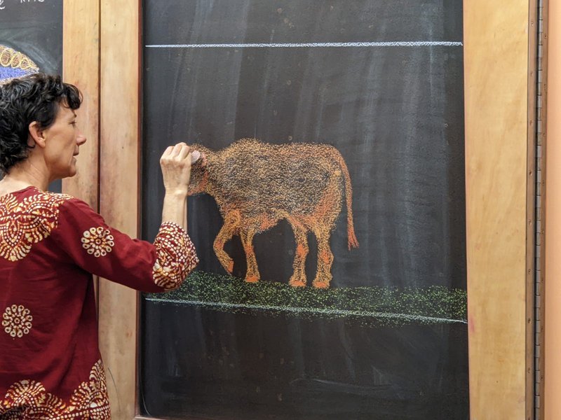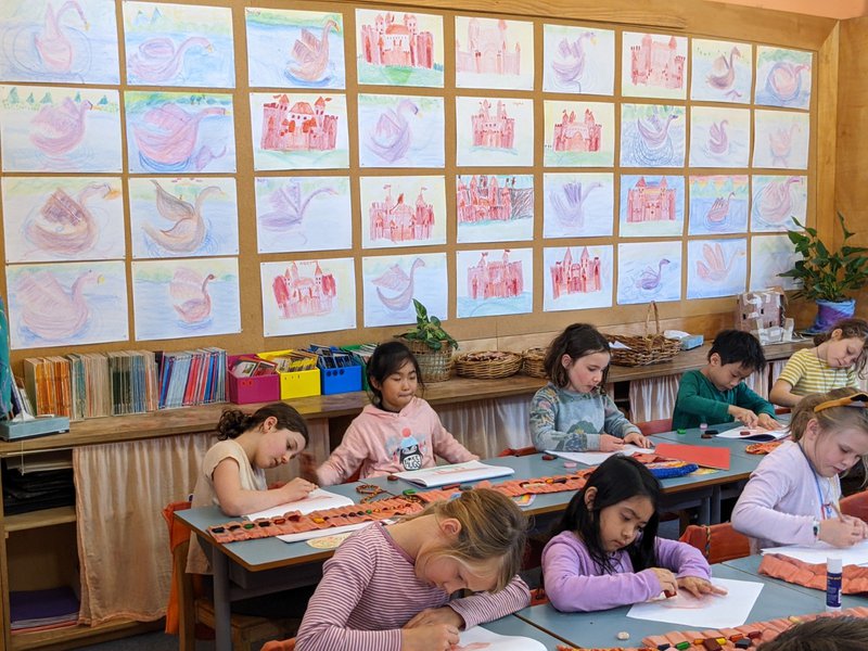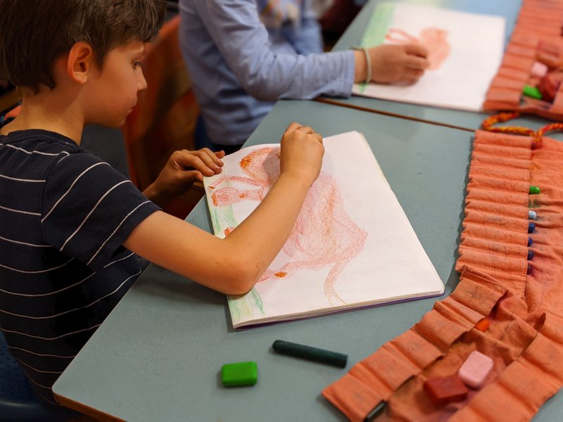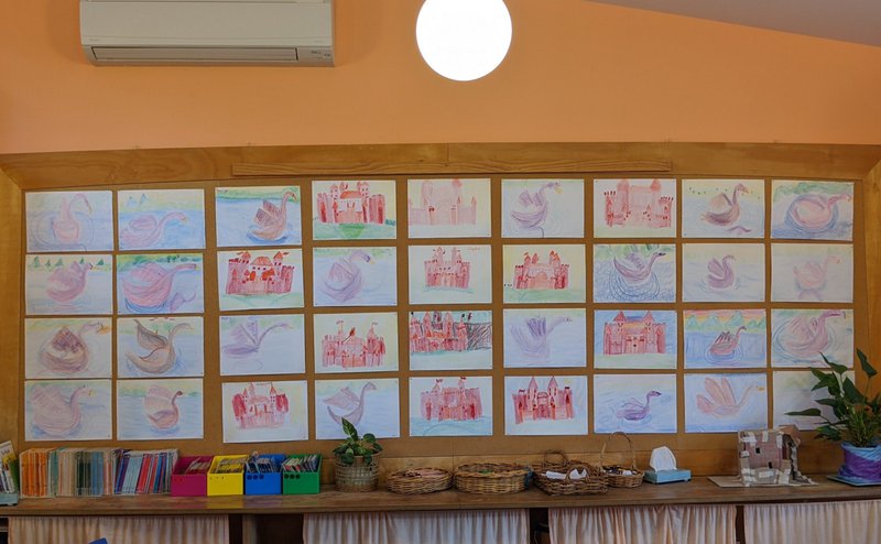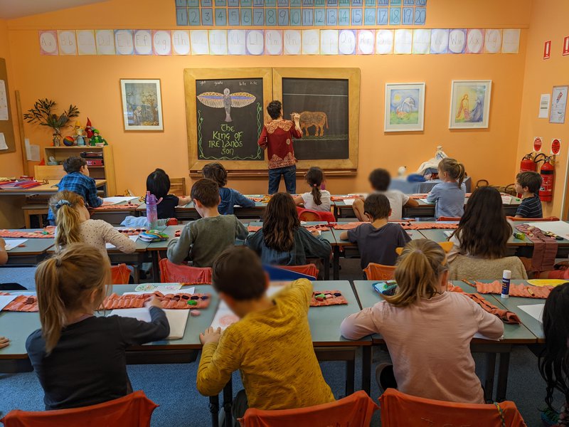 Class 2 have been developing their drawing skills with Class Teacher Prue Ritchie. Taking an image from their Main lesson story, she works with form, shading and gestures to help the children develop their artistic and expressive skills on paper. The children work with crayon and pencil to create beautiful images that are displayed in their classroom. The display board in the classroom is an ever-changing wall of colour and inspiration for all.
