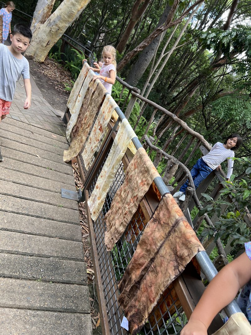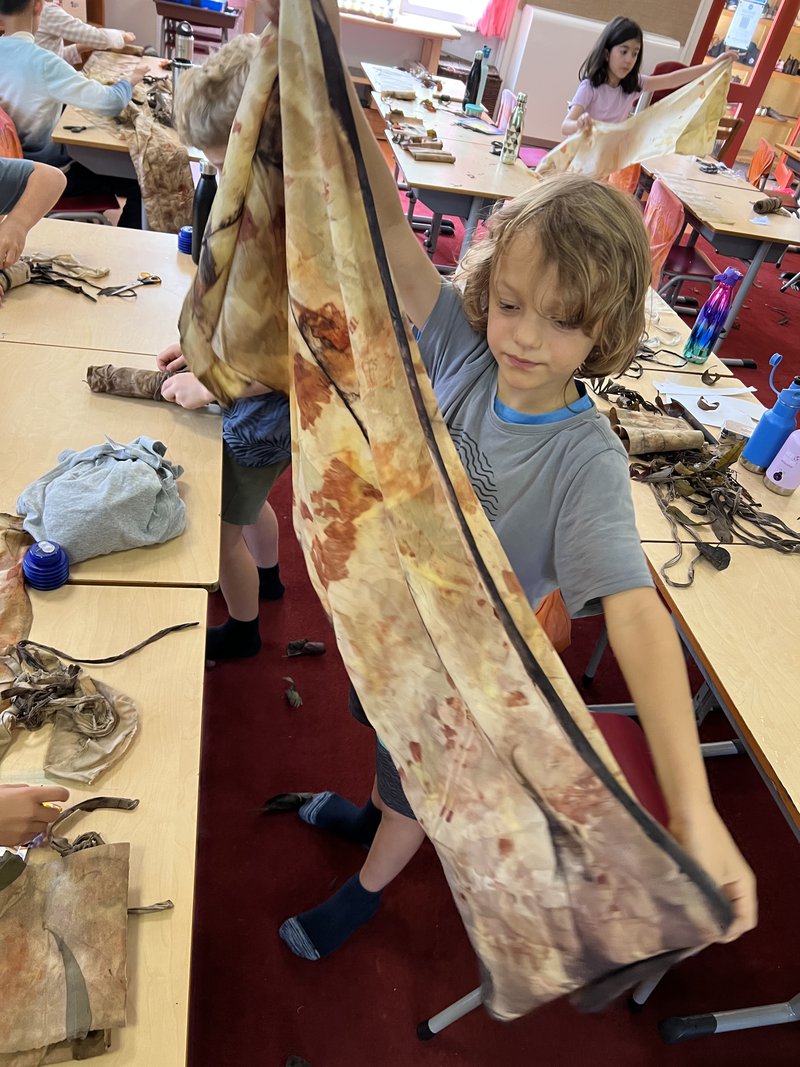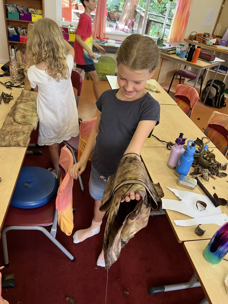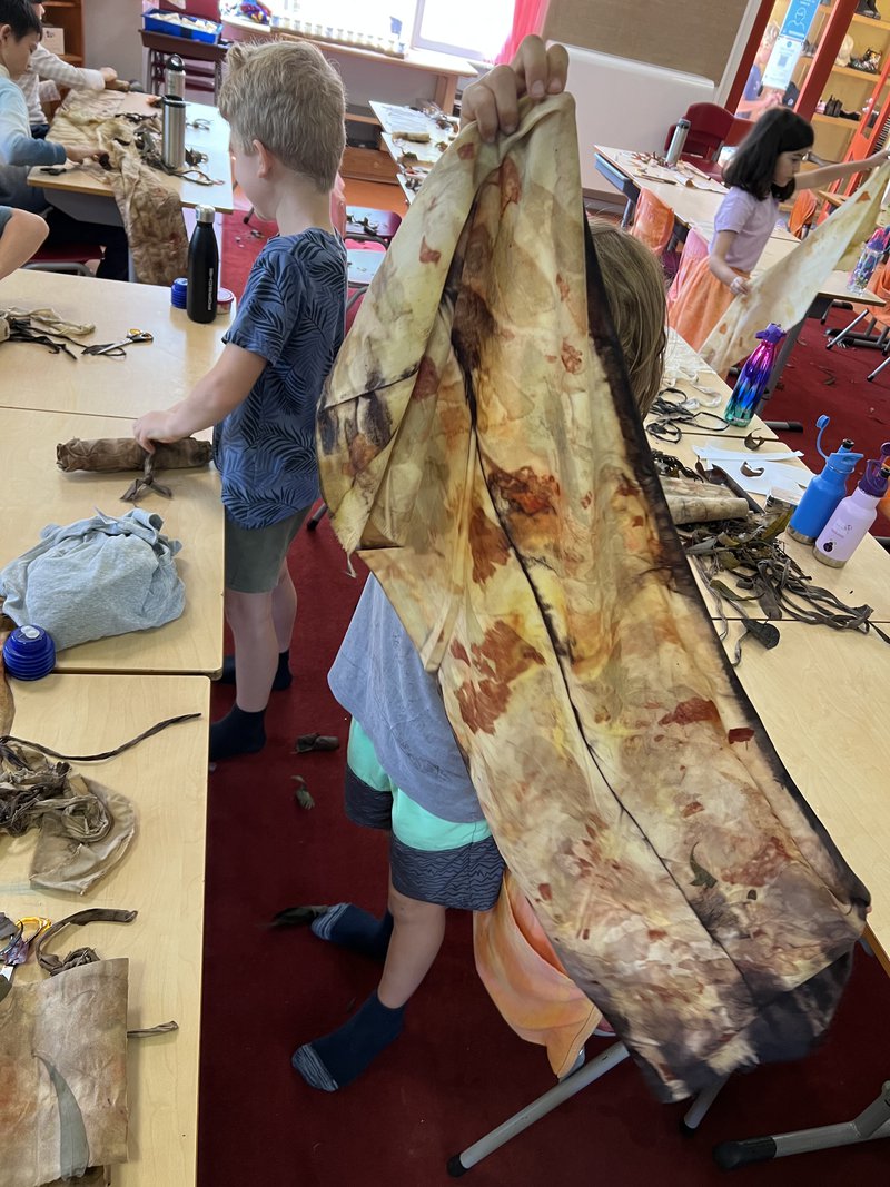 Class 3 children are sewing their very own library bag and have been learning how to eco-dye fabrics with handwork Teacher, Elizabeth Ellean. In their first handwork lesson each student collected windfalls and some plant leaves on a walk around their new campus. The natural plant materials were used, to create beautiful colours and patterns on fabric by wrapping the bundles with plant materials, wrapping, immersing in liquid, then drying.