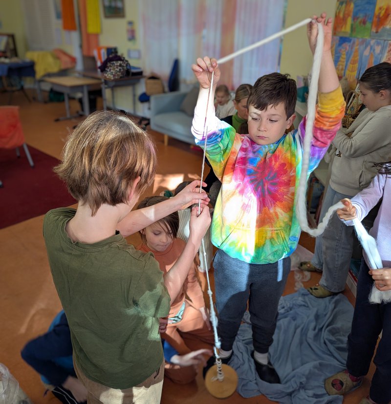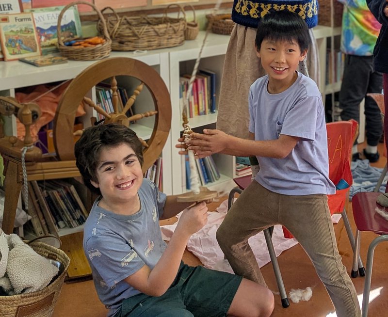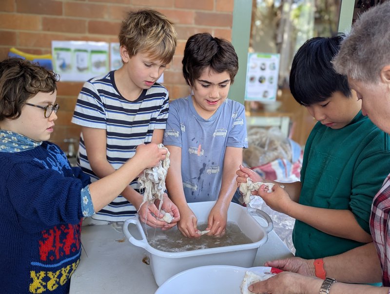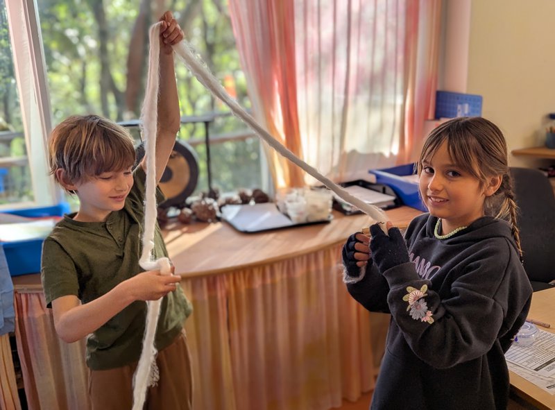 Class 3 had an immersive hands-on experience learning all about fibres and wool production as part of their Farming Main Lesson with Class Teacher Cathy Bower. Handwork teacher Elizabeth Ellean and parent helpers came together to help children wash the sheep's wool and then carded the wool to make it soft and smooth and free of dirt, grasses and burr. Children then learned to spin the wool using a hand or drop spindle. This hand-spun wool was then woven using a hand-made 'Back Strap' loom to begin a belt for each student.
