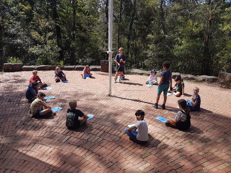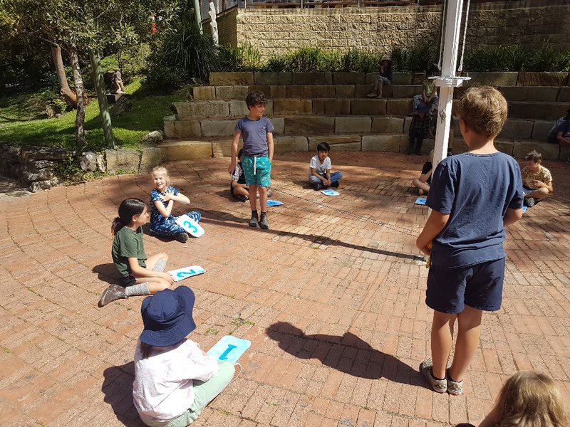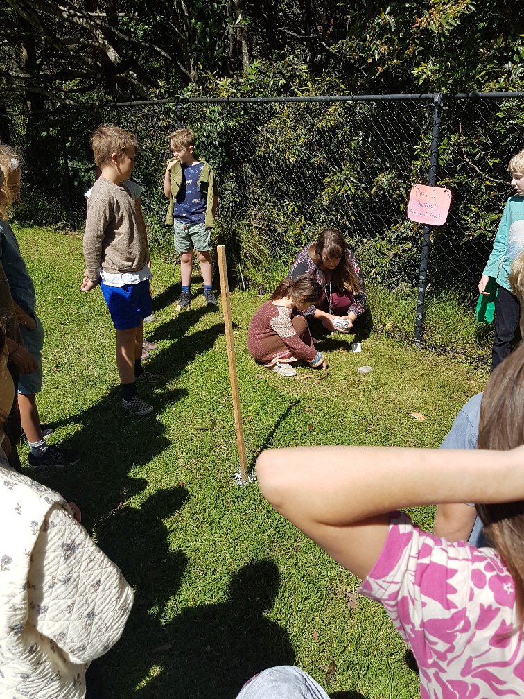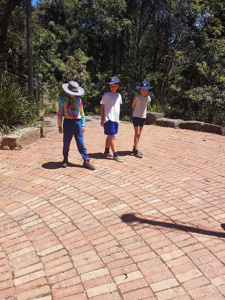 On Monday which was the first sunny day of the Main Lesson, we walked to the school flagpole, just before 9am, to observe the shadow it made. A student came out and walked heel to toe along the shadow’s line and we marked the spot with the number 9 to represent the hour. Next, we walked to the oval where a sundial had been set up by our class assistant Michelle. A stake had been secured in the ground and a string tied to the bottom of it. We brought with us stones and a marker.