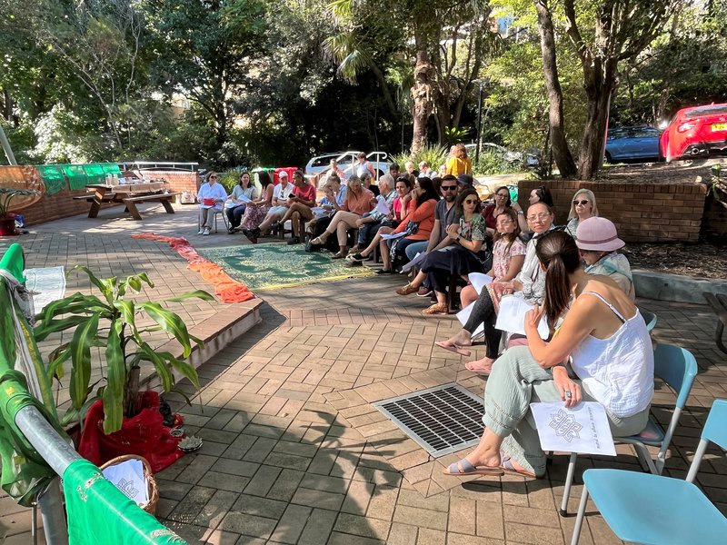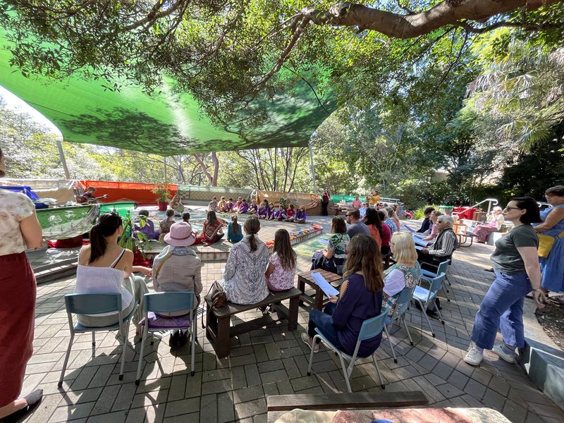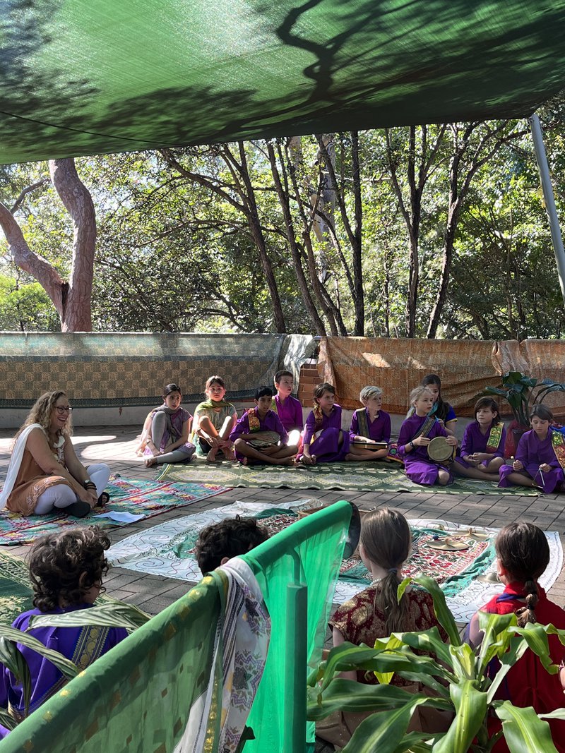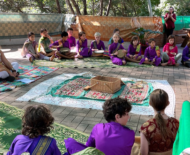 Class 5 Parents reconnected on campus as Class 5 students celebrated their recent Main Lesson topic with an Indian Festival. Students had dressed in traditional Indian dress, incense filled the air, woven fabrics and elephant ornaments decorated the veranda outside Class 5. The students sang, chanted, played instruments and danced.