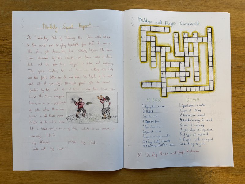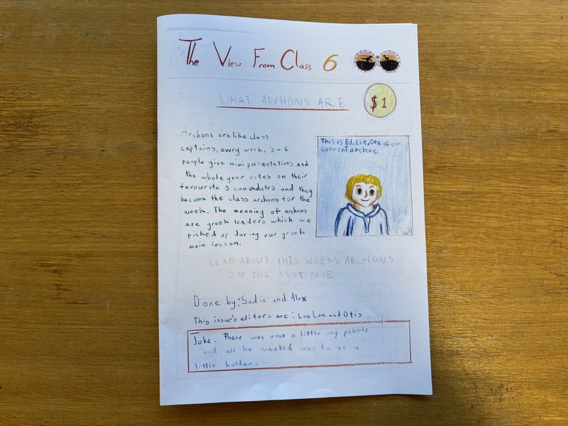 Class 6 has been busy this term writing stories and articles for their Class 6 magazine, The View from Class 6. The first issue has been printed and the students are very excited for their families and teachers to read it. It is a wonderful class project which everyone in the class is involved in. While not every person contributed an article for the first issue, there was plenty to do: drafting, editing, scribing, drawing pictures and compiling it all together ready for printing. So far it has a readership of 70 people, and the class will be using the profits from magazine sales to support their class charity, The Make-a-Wish Foundation, and a portion will also go towards the Class 6 end-of-year celebration.