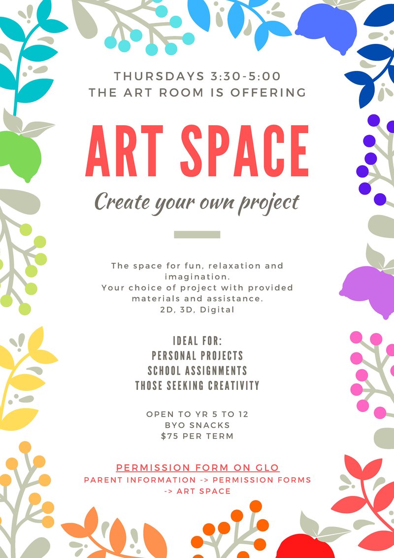 To register for Art Space click through to GLO, and then click on Art Space and fill out the form: https://glo.glenaeon.nsw.edu.au/homepage/1354