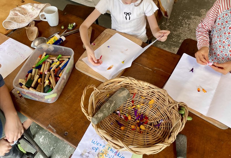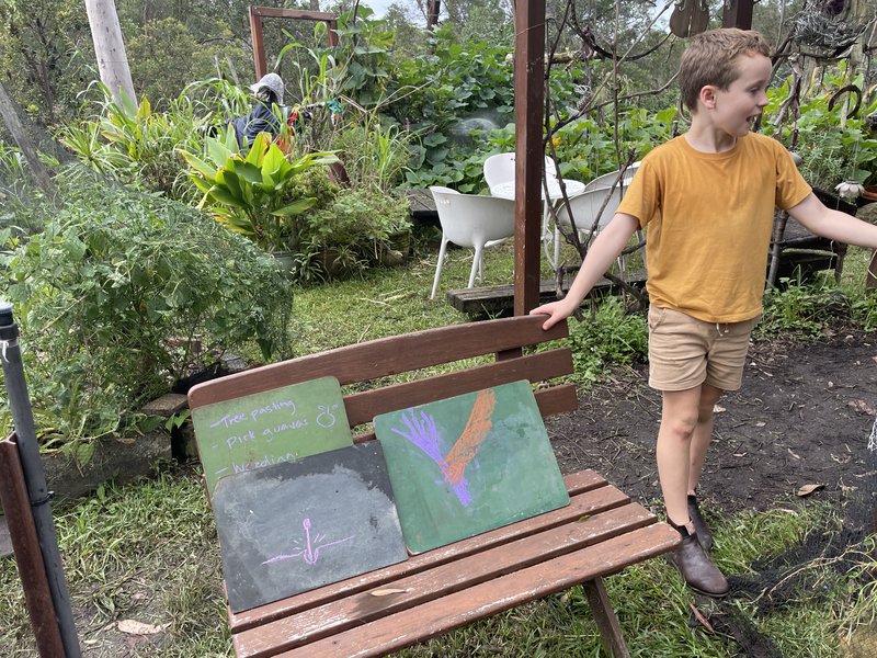 Fast forward to our Middle Cove campus where our incredible garden, held under the loving care of our Biodynamic Gardening teacher, Sandra Frain and her dedicated team, puts the language of nature into practice. Over the last few weeks we’ve seen a more literal exploration of art and the written word in our campus garden! Class 3 are really getting excited by their growing numeracy and literary proficiency as well as their growing understanding of time (how do you divide 90 minutes by the number of tasks to do?). Chalk tablets, a perfect tool to plan who, what and how they would use their garden time. These industrious eight and nine year olds used a combination of words and quick sketches to hatch a plan before diving into the tasks at hand.