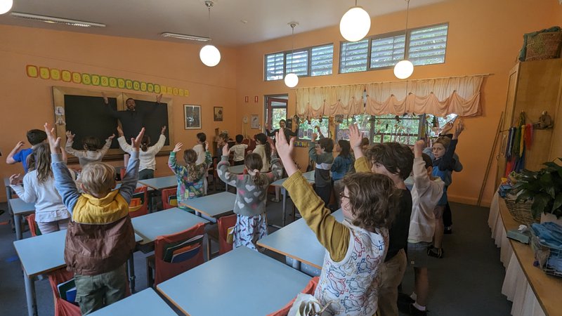 Our Kindy children donned their raincoats and gumboots and took to the playground to reacquaint themselves with their surroundings. The sandpit, muddy puddles and rocks were a big hit. They enjoyed morning circle in the Kindy garden. Class 1 and 2 enjoyed singing songs with their Class Teachers as they popped their indoors slippers on to begin Main Lesson.