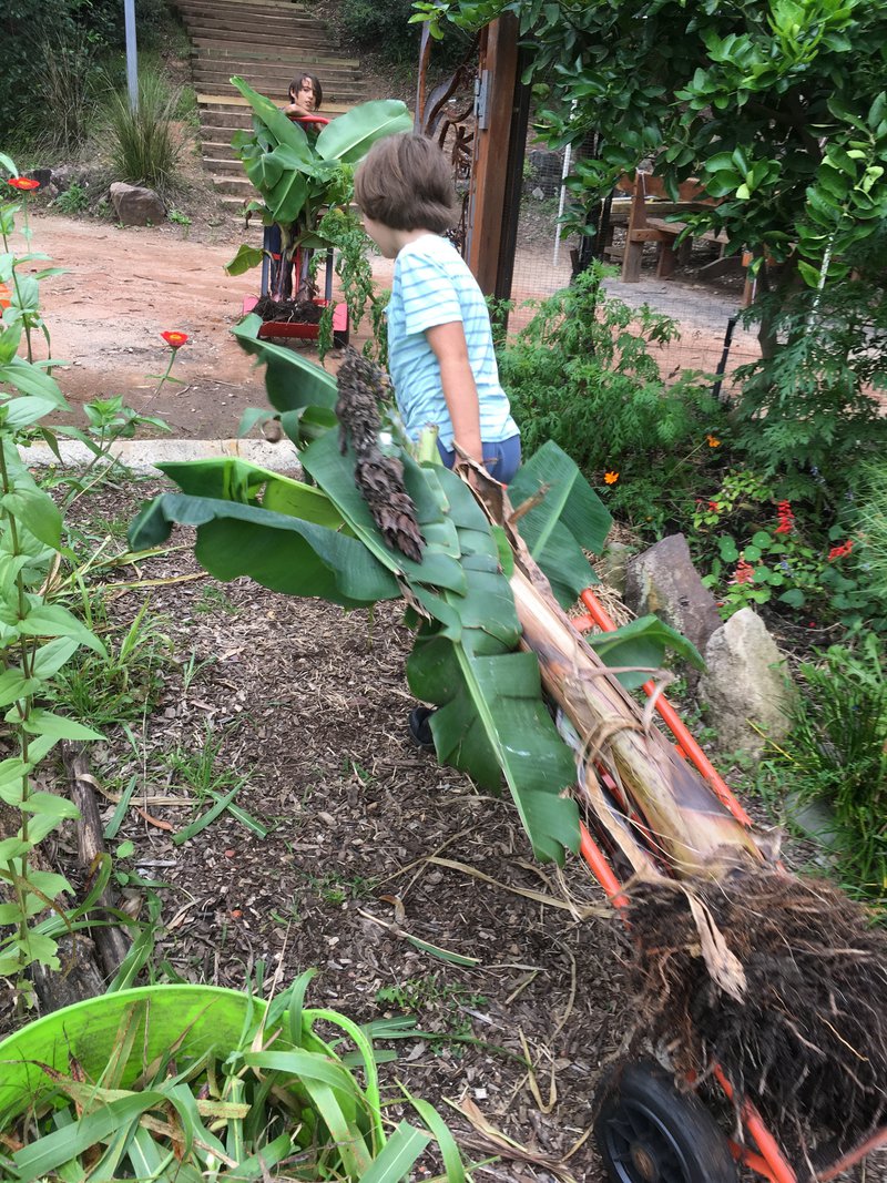 The “school class” that is, students still attending the campus each day, come down to the garden every morning and keep a watchful eye on the vegetables and flowers that are growing, measuring our pumpkins, watching our bees visit their favourite flowers and plant seeds for our winter harvest. The older students have been coming down to the garden again later in the day and getting to work. They have been helping to tend the garden beds, harvesting late summer crops, erecting protective barriers to deter our wildlife visitors and enjoying the beauty of autumn in the garden. We are also doing some preparation in the garden to make way for the new outdoor garden classroom. The banana trees have had to be relocated for the short term. The children have been a great help in keeping our garden well loved and cared for. For those missing the garden, here is a video of Sandra Frain taking care of the flowers and vegetables.