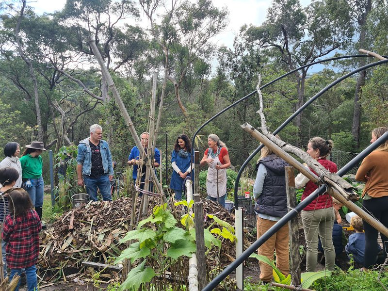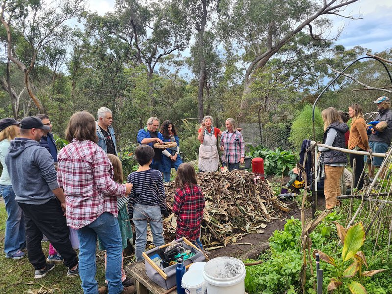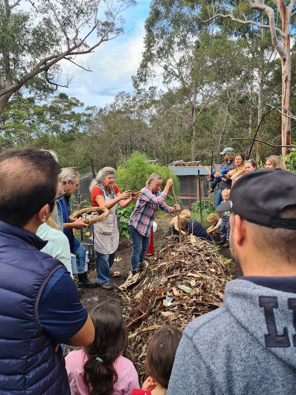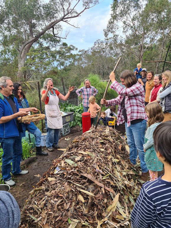 Thunder heard in the distance didn't stop the sun shining on a recent Saturday morning (13th May), as around 50 people gathered in the biodynamic garden at Middle Cove - eager to get their hands dirty and have fun learning about soil creation, aka composting. Adults and children alike had a wonderful experience together with the wise and energetic guidance of Gardening Teacher Sandra Frain.