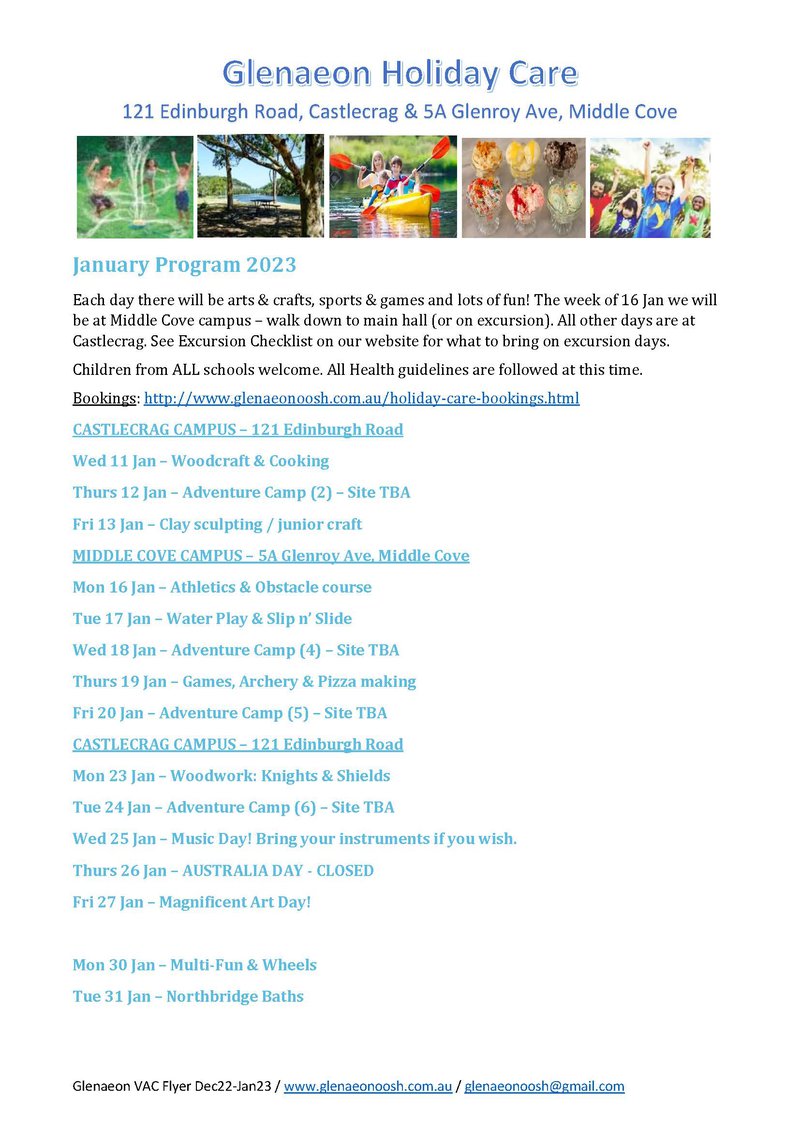 Parents can get more info and Enrol and book on our website at http://www.glenaeonoosh.com.au/holiday-care-bookings.html