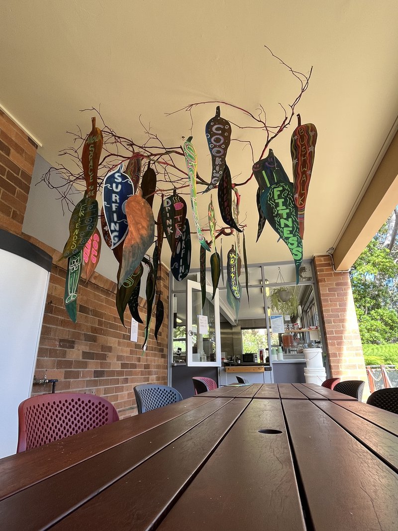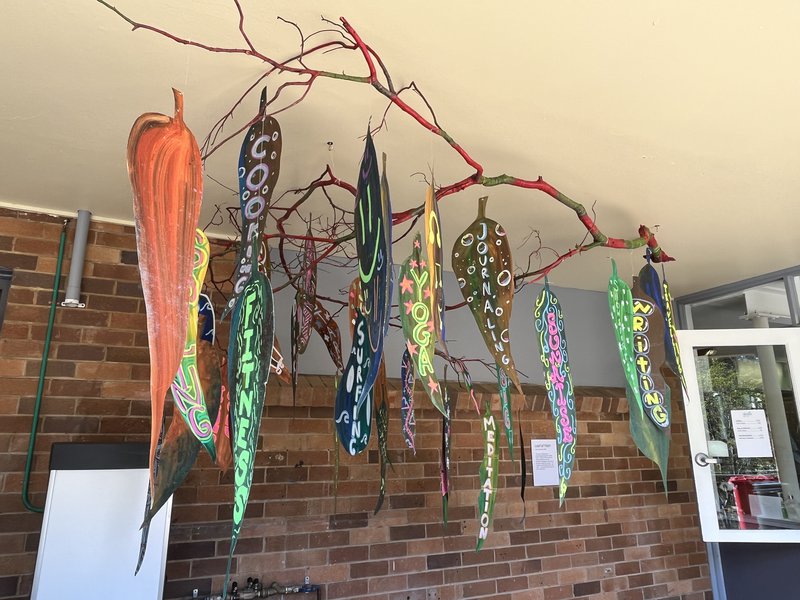 The Cove, a wellbeing program targeted at Year 9 sees the whole cohort meet at school at 7:30am on a Thursday. Students are immersed in the bush, running, walking, participate in outdoor yoga and team building games to encourage connection and wellbeing. There are lots of circle discussions during this early hour while sitting in nature. Because the campus is in nature it is used as the main tool to free the funk! During The Cove, students made and painted the leaves after brainstorming individual recipes for supporting mental health.