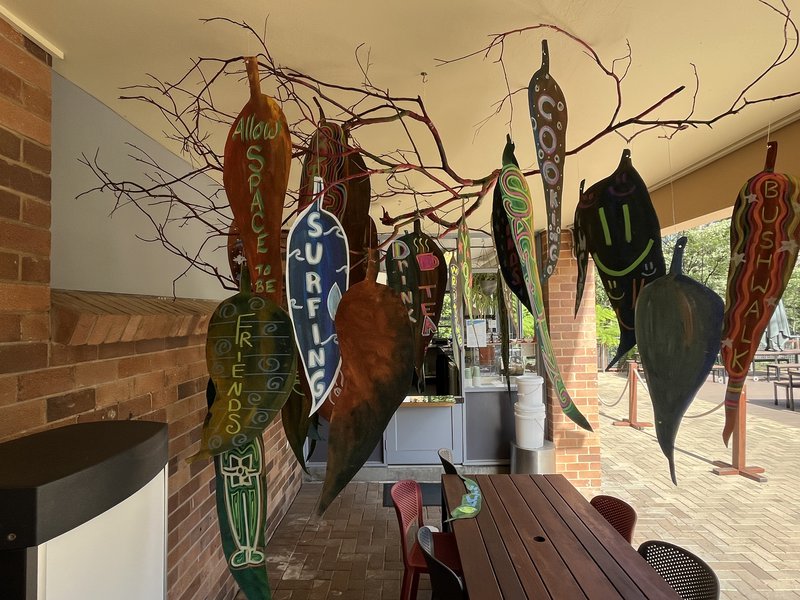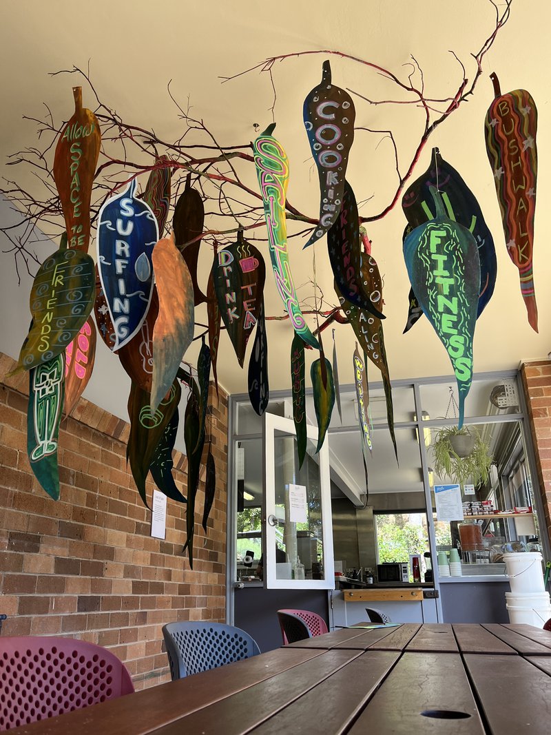 ‘The Coves’ wellbeing tree acknowledging recipes for mental health. The use of fluro colours to make visible these vital and important messages of care that we all need to bring into our lives. The metaphor of the branch as the ‘tree of life’ – that we all have the tools to live our best lives.