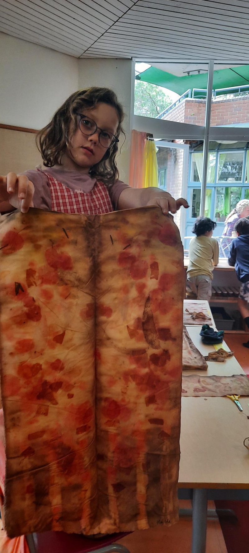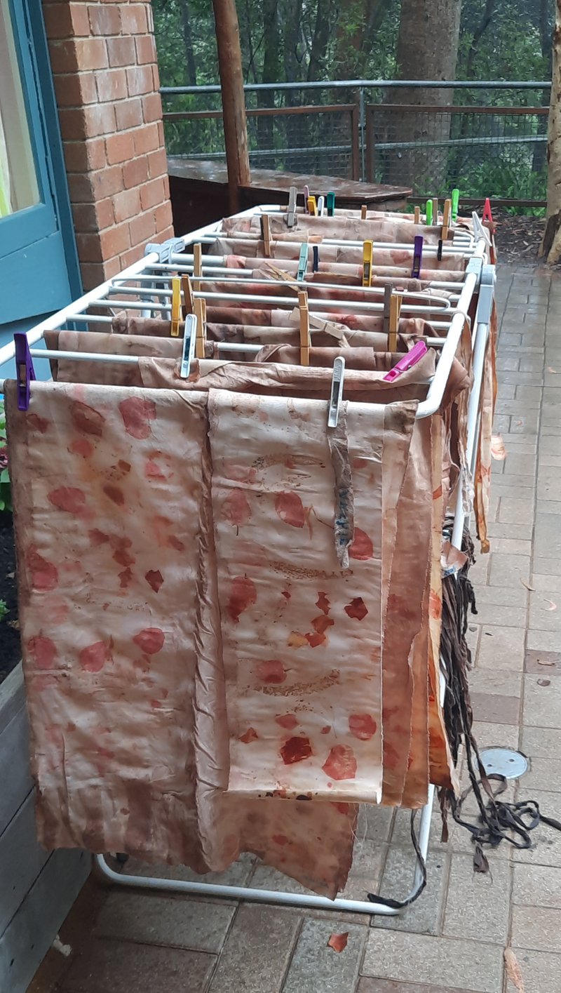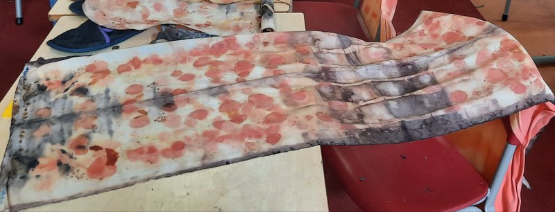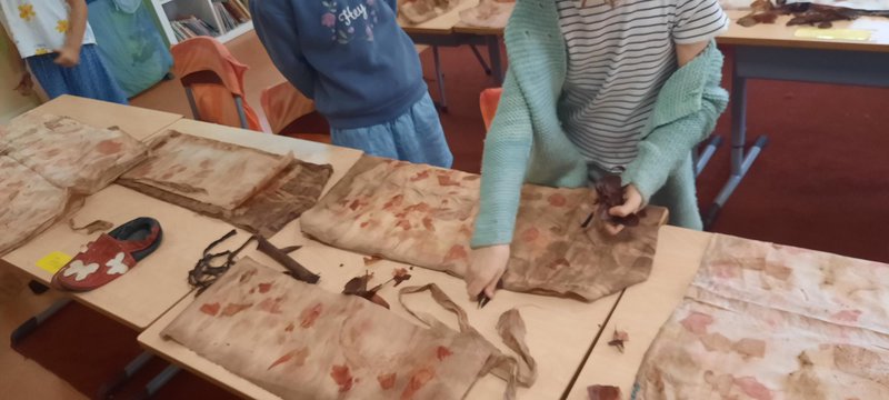 The brown onion skins printed up well and the children had lot of practice wrapping and tying tight knots. After this, their bundles were boiled to allow the plant colours to fill every surface. The leaves left prints which were revealed to the children's delight as they unraveled their parcels.