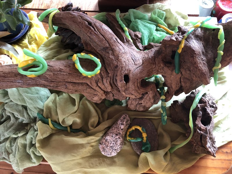 The Kindy garden had a surprise visitor recently - a beautiful tree snake. It must have heard our week's story on the winds: How the snake got its hiss. It stayed a long time and gave the children ample opportunity to watch; it was very still - "just like a statue" said one of the children. They also made beautiful beeswax snakes in the classroom, all sitting on a log.
