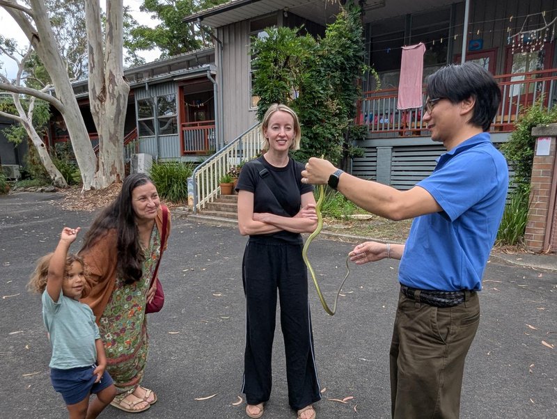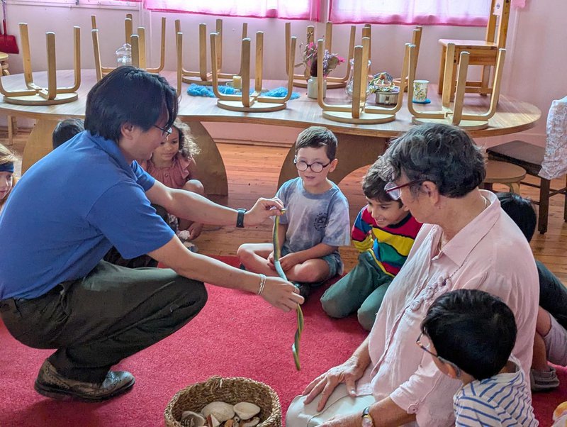 Our celebrations culminated this week in a surprising visit from a real snake! Slither the Green Snake unexpectedly found his way into the Waratah classroom. Perhaps he had been seeking shelter after the very dramatic storm we had all witnessed the day before, or perhaps he just came to continue celebrating the Year of the Snake. Well, we didn’t stop to ask him why he was there. Instead, we gave a brief hello before quickly evacuating into the Wattle classroom where we all shared lunch and rest together while Stanley the Snake Catcher (Dr Stanley Tang who teaches Science and Maths in the High School) came to catch and relocate the snake. Thanks to Stanley we had a wonderful opportunity to have a close up look at the beautiful green snake who had come to visit our Kindergarten. What an adventurous start to the New Year.