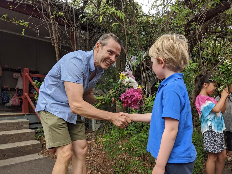 The first day in Class 1 is always a special time. Students began with their walk under the ‘Rainbow Bridge’. After spending their morning in the Kindergarten playground with teachers Catherine and Sarah, they then walked under a tunnel of hands and rainbow silk formed by Class 2 students. Emerging from the rainbow, they greeted their Class Teacher Rodney Dean with a flower and the first of many handshakes. This ceremony marks the beginning of the Class Teacher cycle which continues throughout primary school.