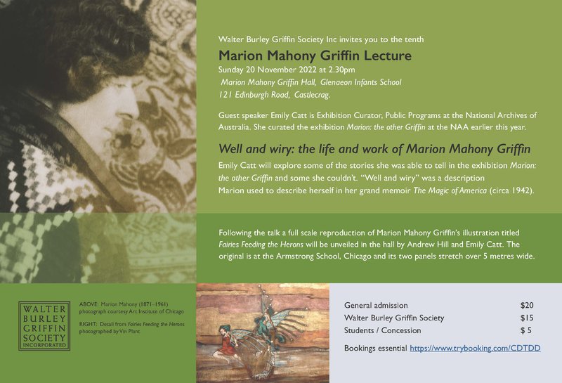 The Walter Burley Griffin Society will be holding its Marion Mahony Griffin Lecture in our Marion Mahony Griffin Hall next Sunday 20th November. There was a recent exhibition in the National Archives of Australia which featured a large mural that Marion painted in 1932 in the hallway of the George B. Armstrong Elementary School in Chicago (see pic). Her sister was a teacher there at the time, and on Marion’s return to the US for a short period she spent some time completing this remarkable mural as a gift to the school. It’s still there!