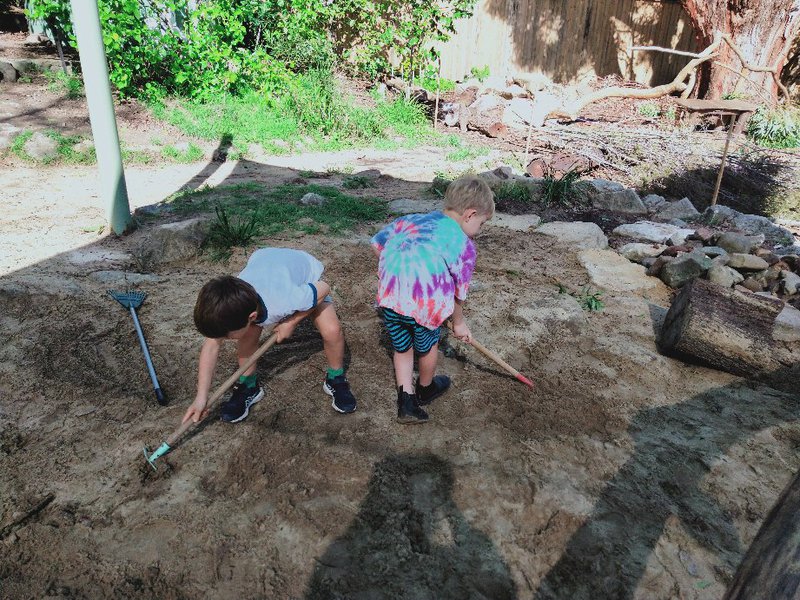 Meaningful work is part of play in Kindergarten, as the children learn by watching and imitating purposeful activities. Here in the Kindergarten playground, the children tend to their own play areas, digging and raking the leaves, weeds and debris away to create a lovely playground and a clean sandpit! After their work, they sit and enjoy a cup of herb tea from the garden. "The best tea EVER!" they say.