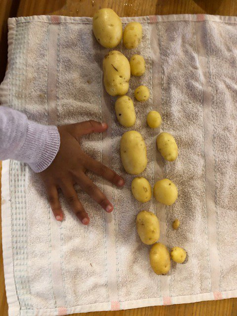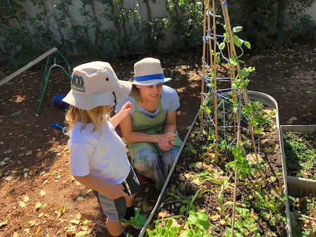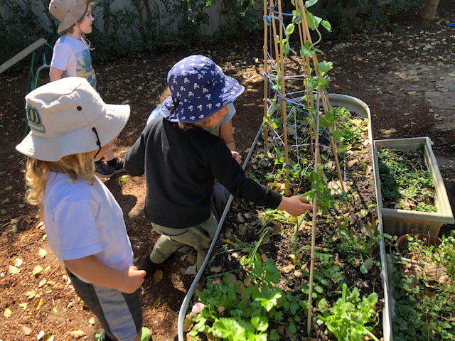Snow peas and sugar snap peas are growing from their flowers and the children are very excited to spot them and check their growth.