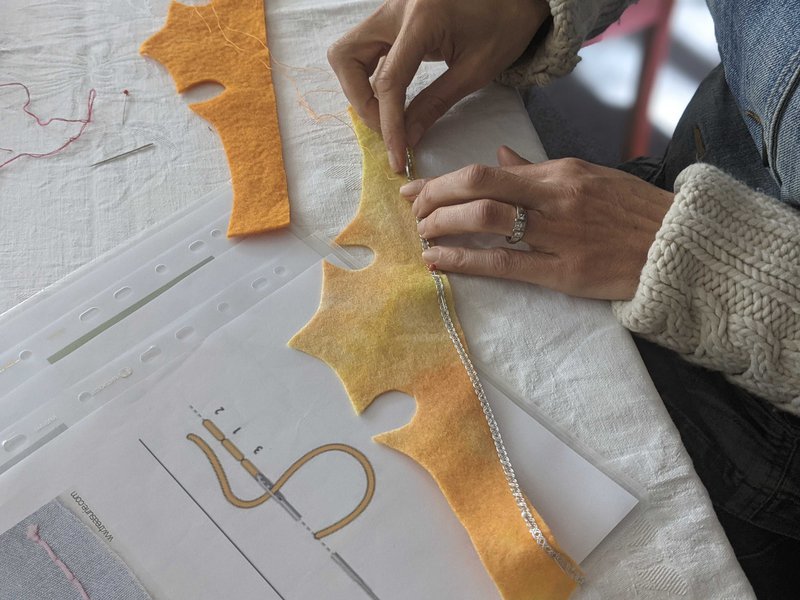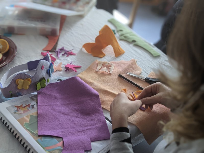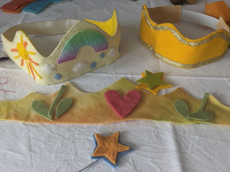 Kindergarten Parents meet once a week also, and have recently made beautiful felt flowers, starting with coloured roving (soft, fleeced wool), massaging and felting the colours together. Both groups have been making crowns - birthday crowns, as well as a play set for the Kindergarten classrooms.