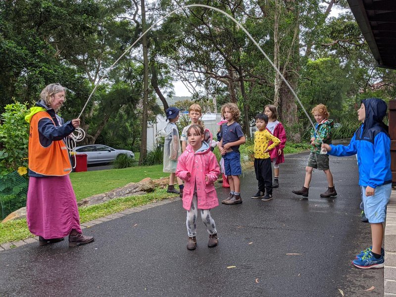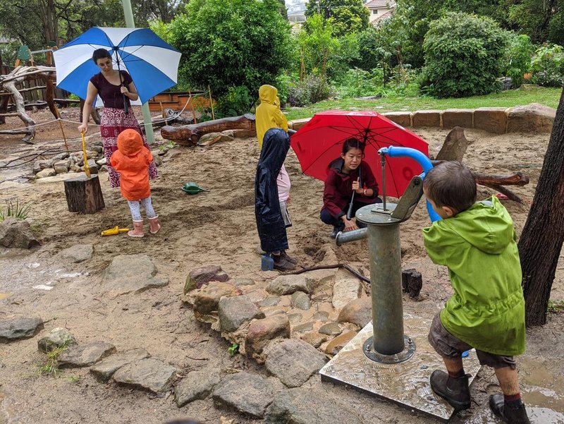Rainy days are welcomed at Castlecrag – from skipping in the rain before school starts, to digging trenches and rivers in the Kindergarten sandpit. The children also pump water which courses towards the sandpit in their hand-built channels, making rivers flow under bridges and over rocks.