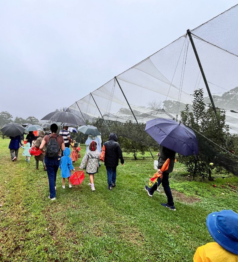 Last week, our Preschool families braved the uncertain weather and gathered at Cedric’s Bilpin Springs Orchard for our annual apple-picking day. In the morning, with rain in the forecast, we wondered if the event would go ahead. However, a small window of clear weather was predicted from 10-12 am—just in time for our arrival! Having both lived in the UK, Lesley and I are no strangers to rainy days, so we decided to take the chance and sent out an email confirming that apple picking was still on. To our delight, we had a fantastic turnout!