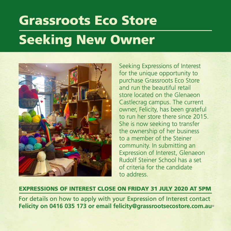 Seeking a new owner/operator for Grassroots Eco Store and the beautiful retail store conveniently located on the Castlecrag campus. Felicity has thoroughly enjoyed her association with the Glenaeon community and has been grateful and honoured to run her store at Castlecrag since October 2015. However, she is now seeking to transfer the ownership of her business to a member of our community and is offering the unique opportunity to purchase and operate Grassroots Eco Store.