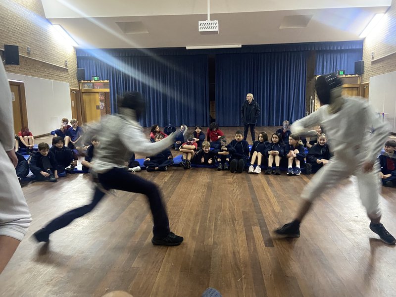 High School fencers, Sean, Angus, Rafello and Jasper became performers last week giving our Class 5 and 6 students a lesson and demonstration of the finer points of fencing. Students had a chance to handle a foil and learn about the equipment, rules and tactics to successfully win what the group described as a "cross between boxing and chess while holding swords!"