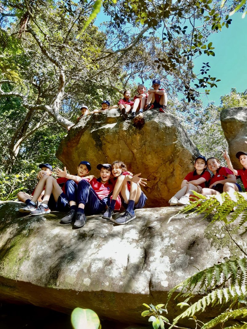 Jonas is teaching PDH content outside for that reason in the school’s rotunda adjacent to the courts, but newly inspired by the seminar, we decided to take the class over to an even prettier part of the campus to the rocks beside the waterfall. It was there, that I taught my very first lesson of Personal Development and Health (PDH) in year 7. That meant, first of all, a jog across the courts and the oval, climbing over the little creek and climbing the boulders to find an appropriate sport as an outdoor classroom. Just arriving at this remote and calm spot, the children became aware of the different sounds and sensations from these new surroundings.