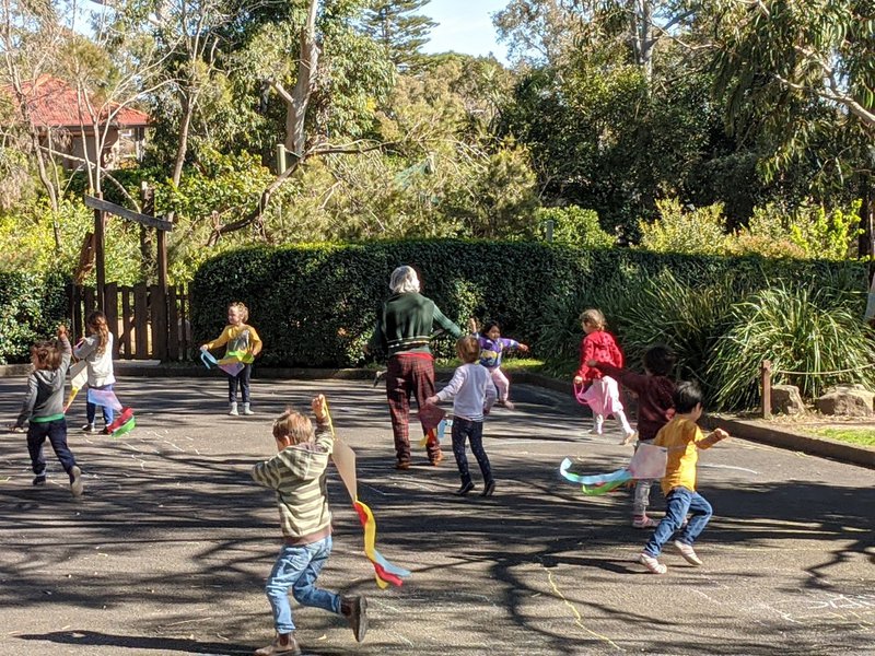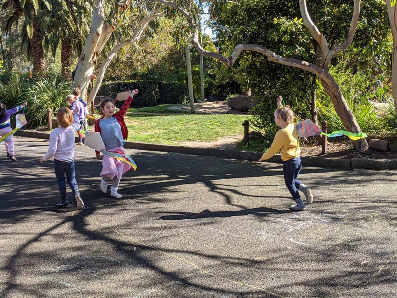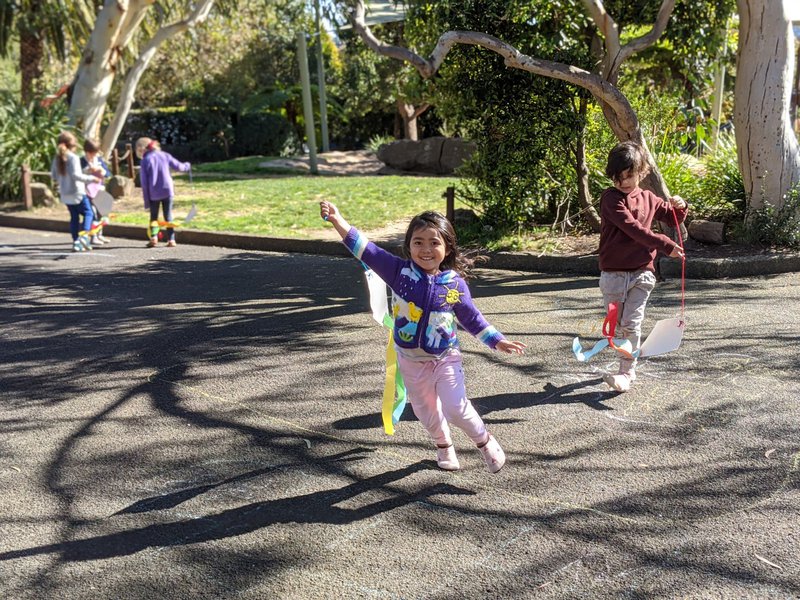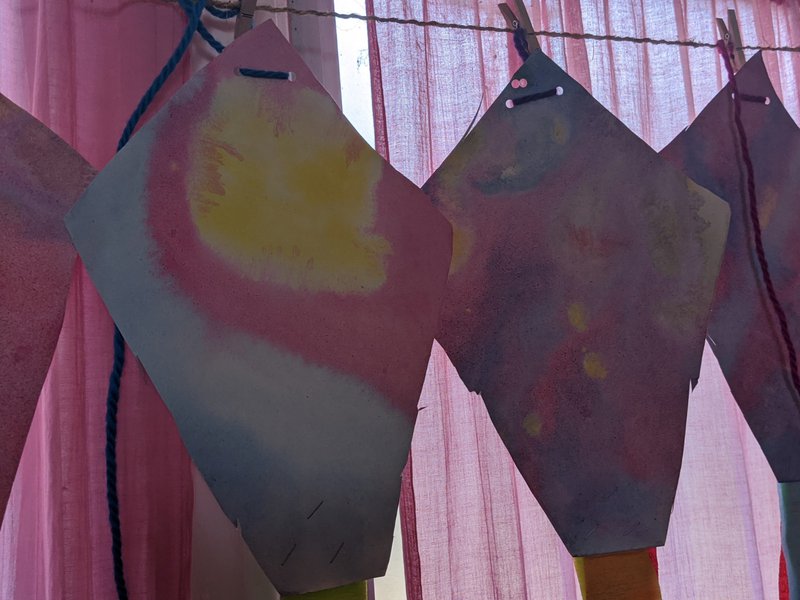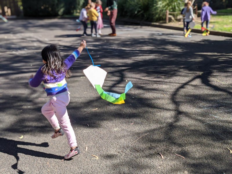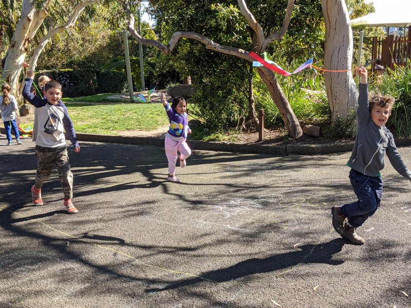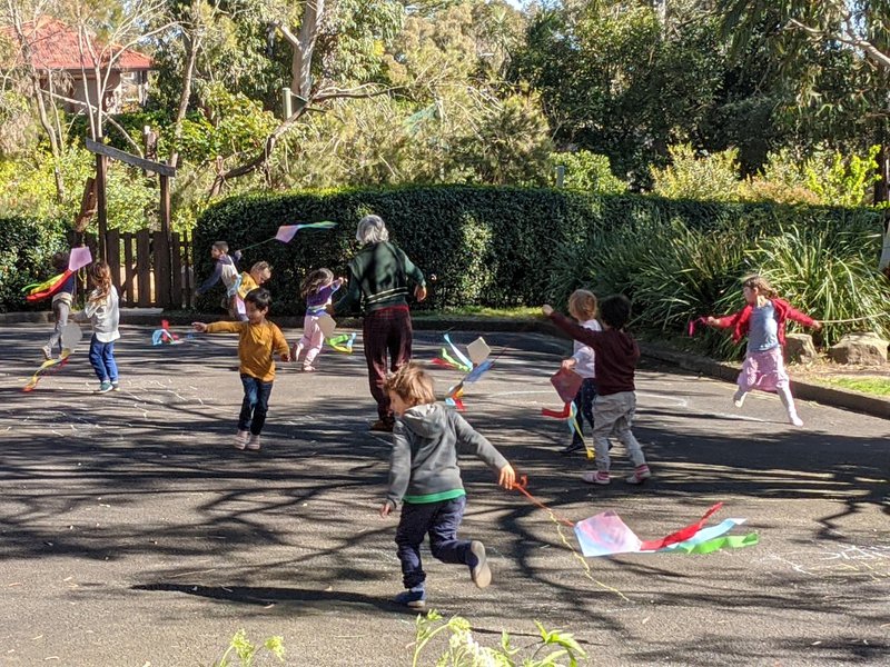 It's gusty in August and Kindy made beautiful hand-painted kites. They take them out for a run when it's windy, and the colours and their delight is just as beautiful.