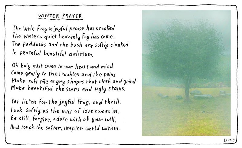 Michael Leunig captures the different moods of winter mood so perfectly that there is not much to add. We can touch both the “simpler, softer world within”, as well as the little things of beauty that we find outside us.