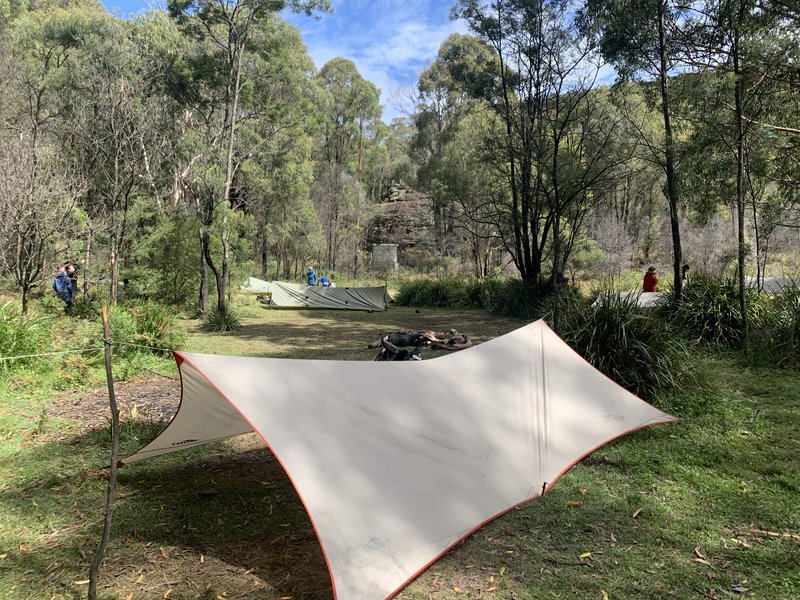 The campers heading out to Deep Pass needed an overnight pack of food and clothes. They headed out on a 2km, downhill trek through the bush to their campsite. The Wollemi National Park boasts some of the prettiest scenery; a valley surrounded by incredible cliffs, cascading waterfalls and winding creeks. We explored the nearby rock pools; a meeting place for the Wiradjuri, Gundungurra and Darug people that contains ancient handprints; and the T-Slot canyon that squeezes its way through the middle of a mountain. The students arranged their new campsite using tarps for cover. Being carefully guided in the correct placement and setting of their tarps to ensure a dry bed for the night. In the second week this was especially important as it rained most nights. The students’ tarp building skills were exceptional and they remained mostly dry.